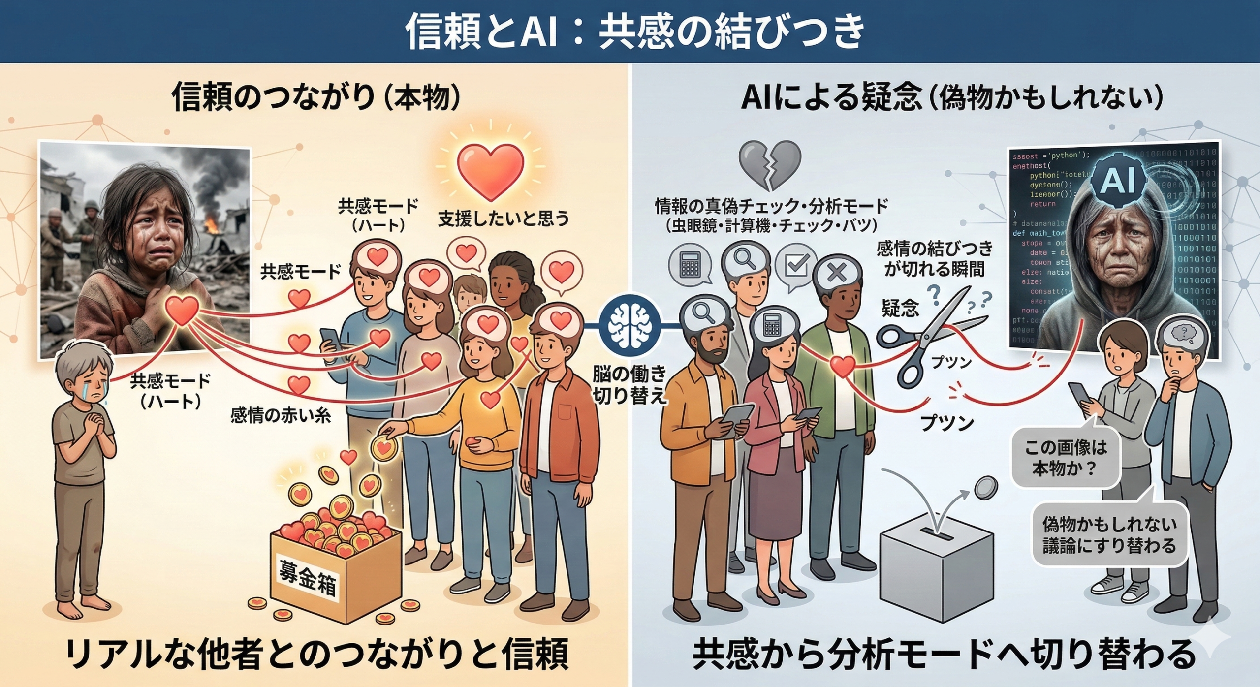 でも、目の前にある画像が「AIによって計算して作られたものかもしれない」と疑った瞬間、その「感情的な結びつき(エモーショナル・コネクション)」がプツンと切れてしまうんだ。心理学的に言うと、脳の働きが「他者への共感モード」から「情報の真偽をチェックする分析モード」に切り替わっちゃうんだね。だから、支援の話題ではなく「この画像は本物か偽物か」という議論にすり替わってしまったわけ!