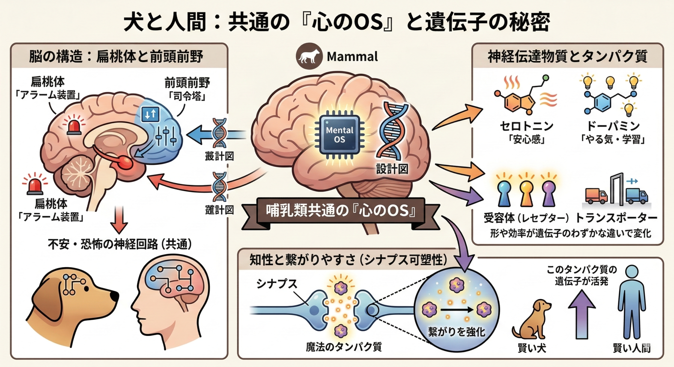「犬と人間で、なんでこんなにも同じ遺伝子が働いているの?」って不思議に思うよね。ここからがサイエンスの本当の面白さ!その秘密は、僕たちの脳内で作られる神経伝達物質と、脳の基本構造にあるんだ。