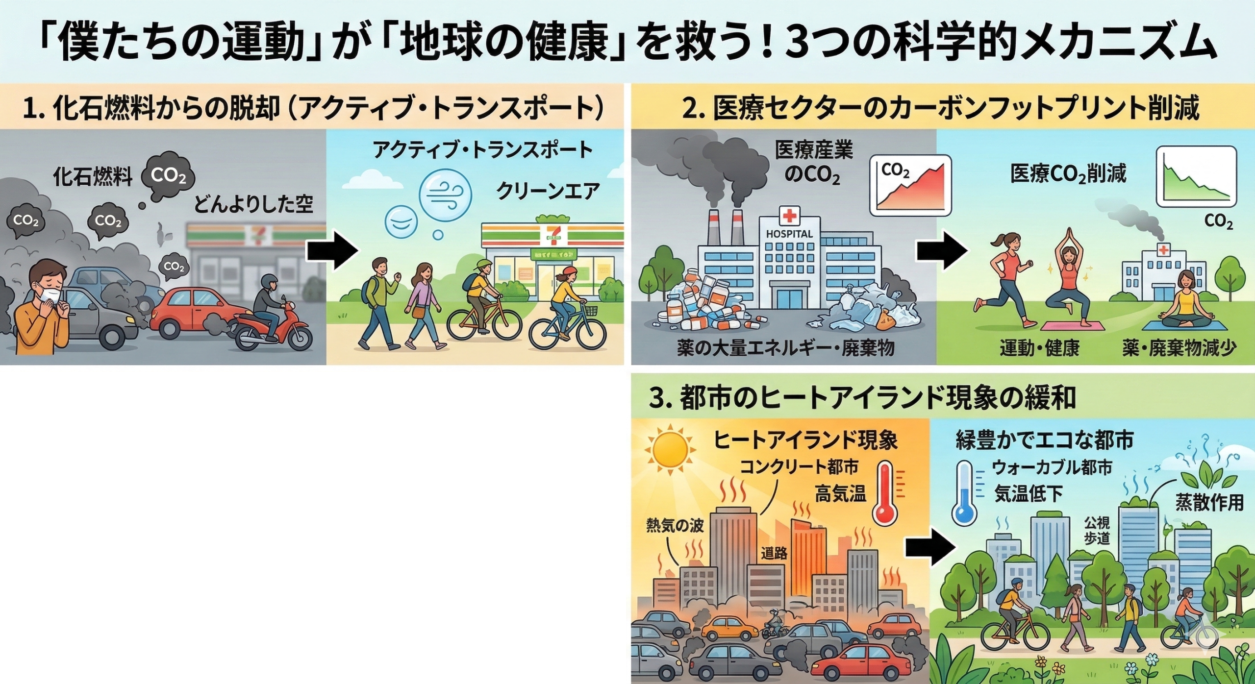 じゃあ、どうして「僕たちの運動」が「地球の健康」を救うことになるのか?その科学的なメカニズムを、さらに深く解き明かしていくよ!理由は大きく3つあるんだ。