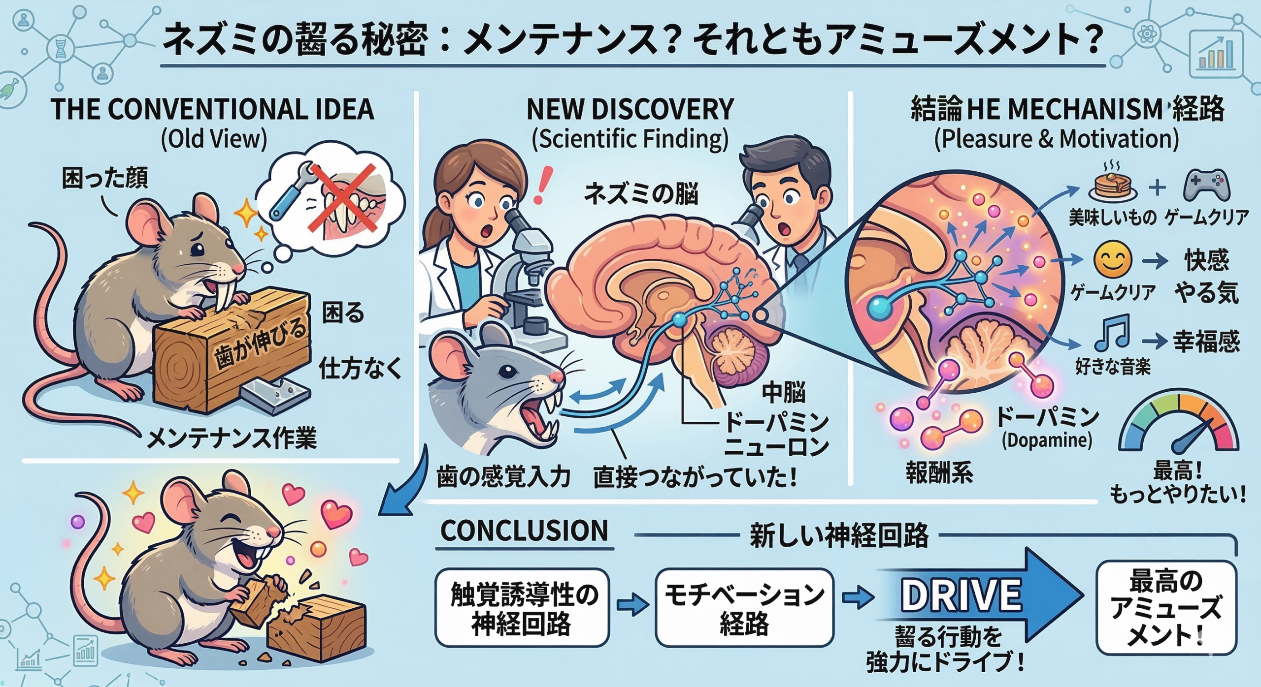 歯を齧るたびにドーパミンが出るように脳の回路を繋ぎ変えてしまえば、ネズミたちは「やらなきゃいけないから」ではなく、「やりたいから!気持ちいいから!」という自発的なモチベーションで、毎日喜んでガリガリするようになる。結果として、誰もサボることなく完璧に歯の長さを保ち、顎の健康を維持できるようになったんだ。この強烈な「モチベーション経路」こそが、げっ歯類が地球上のあらゆる環境に適応し、これほどまでに繁栄することができた大きな秘密だったんだよ!
