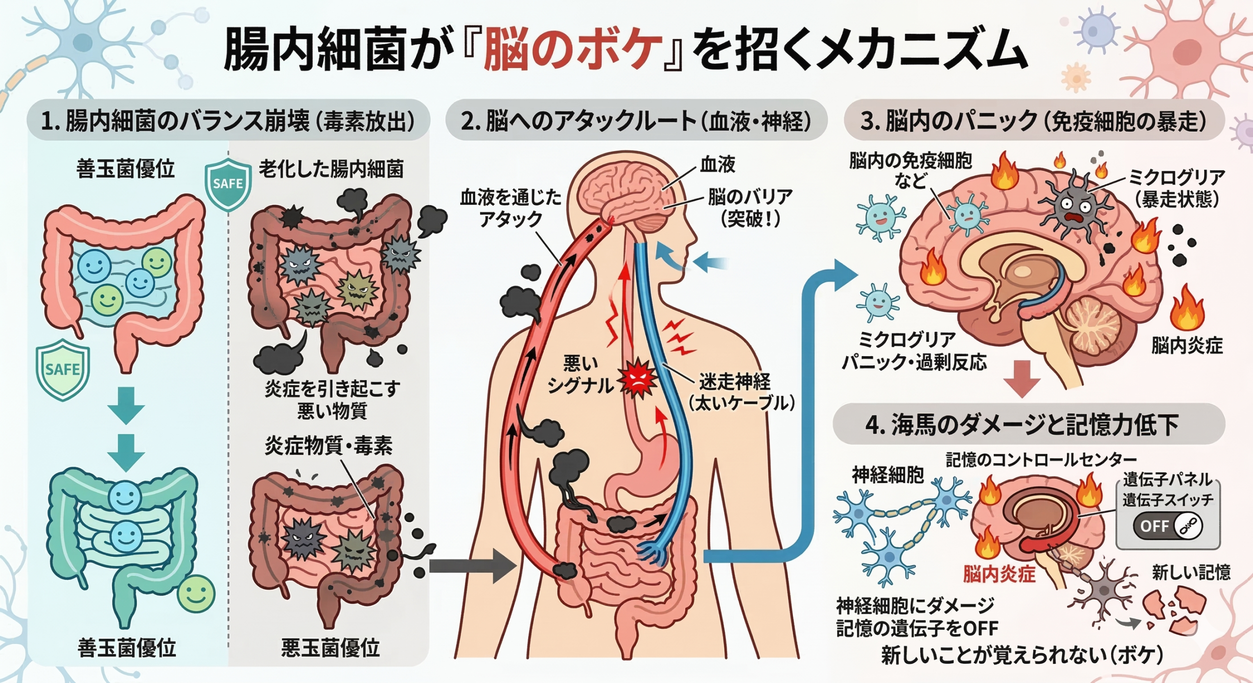 突然だけど、キミは「最近物忘れが激しいな…」って感じること、ある? 年をとると新しいことが覚えられなくなったり、記憶力が落ちちゃったりするのは、誰もが知っている「脳の老化」のせいだよね。でもね、最新の研究で、この脳の老化のスイッチを握っているのが、実はお腹の中の腸内細菌かもしれないっていう、とんでもないことがわかったんだ!