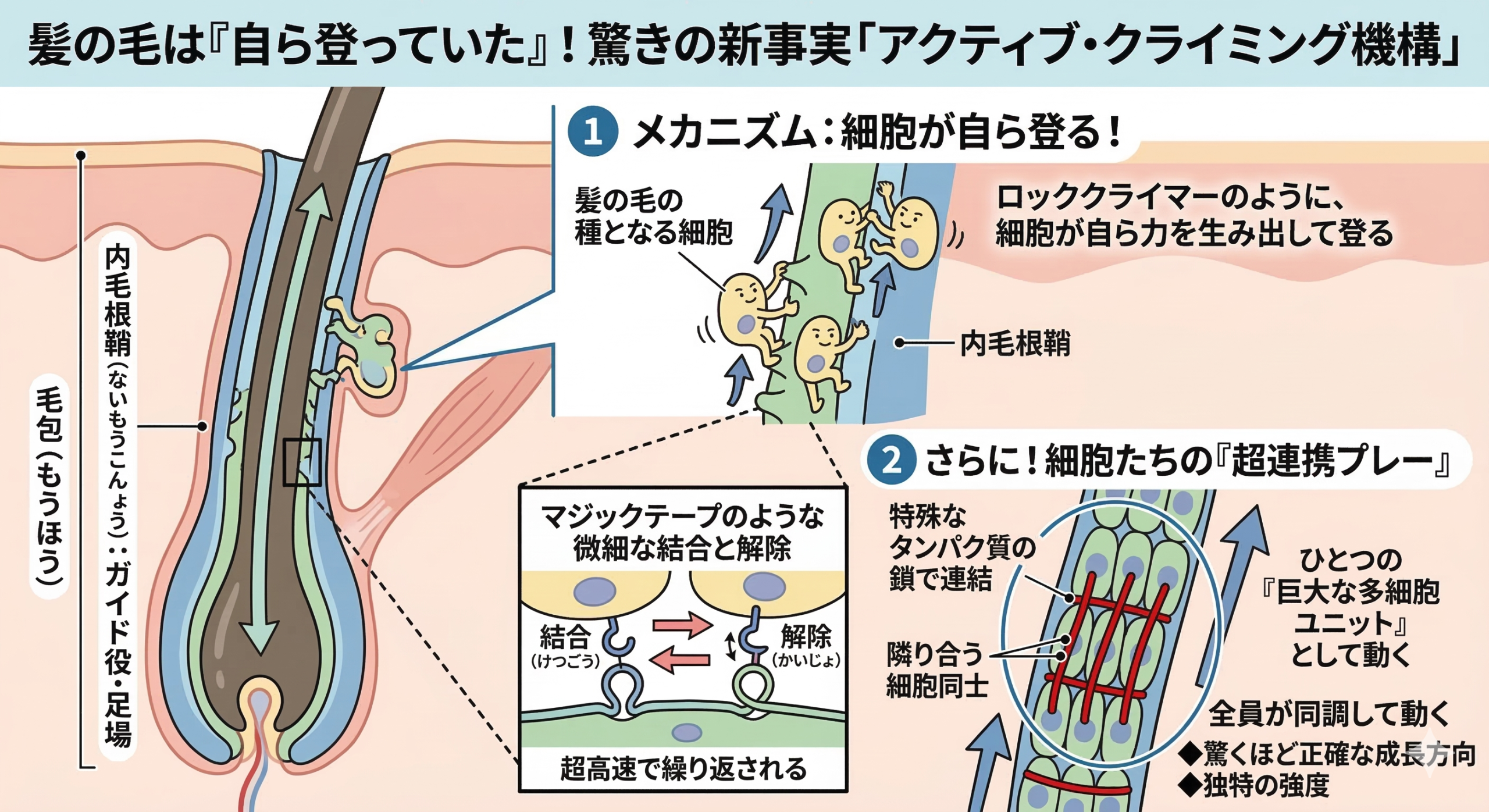 具体的には、毛包の中にある「内毛根鞘(ないもうこんしょう)」というガイド役の組織と、伸びていく髪の毛の種となる細胞との間で、まるでマジックテープのような微細な結合と解除が超高速で繰り返されていたんだよ。このメカニズムを研究チームは「アクティブ・クライミング(能動的登攀)機構」と名付けたんだ。面白いよね!まるでロッククライマーが壁を登るように、細胞が自ら進むべき方向へ力を生み出していたなんて、誰も想像していなかったんだ。