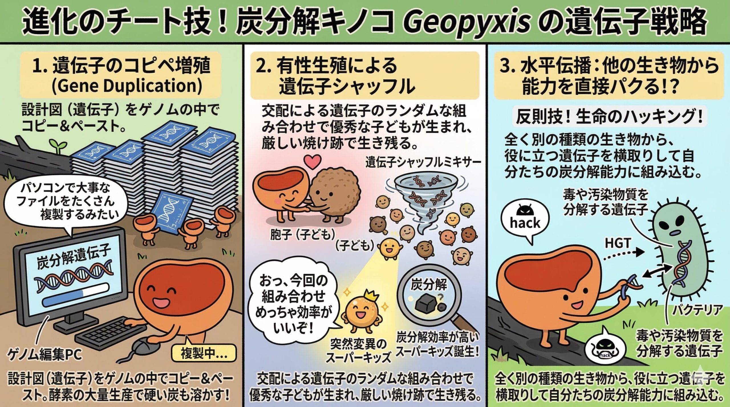 そして3つ目!これがグラスマン博士も一番興奮したという「水平伝播(Horizontal Gene Transfer)」というメカニズムだよ。普通、遺伝子って親から子へ(縦のラインで)受け継がれるものだよね。でも水平伝播は、なんと「全く別の種類の生き物」から、役に立つ遺伝子だけをポンッと横取りしちゃうという反則技なんだ!バクテリアの世界ではよくあることなんだけど、キノコなどの真核生物でこれを発見するのはすごいこと。火災菌たちは、他の微生物が持っていた「毒や汚染物質を分解する遺伝子」などを直接ゲットして、自分たちの炭分解能力に組み込んで進化したと考えられているんだ。生命のハッキングって感じでワクワクするよね!