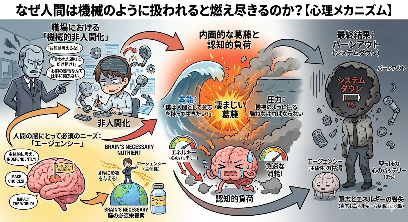 ここからが今日の一番面白いところ!知的好奇心全開でいくよ!なぜ人間は、機械のように扱われると燃え尽きてしまうのか?その心理メカニズムを深く掘り下げてみよう。
