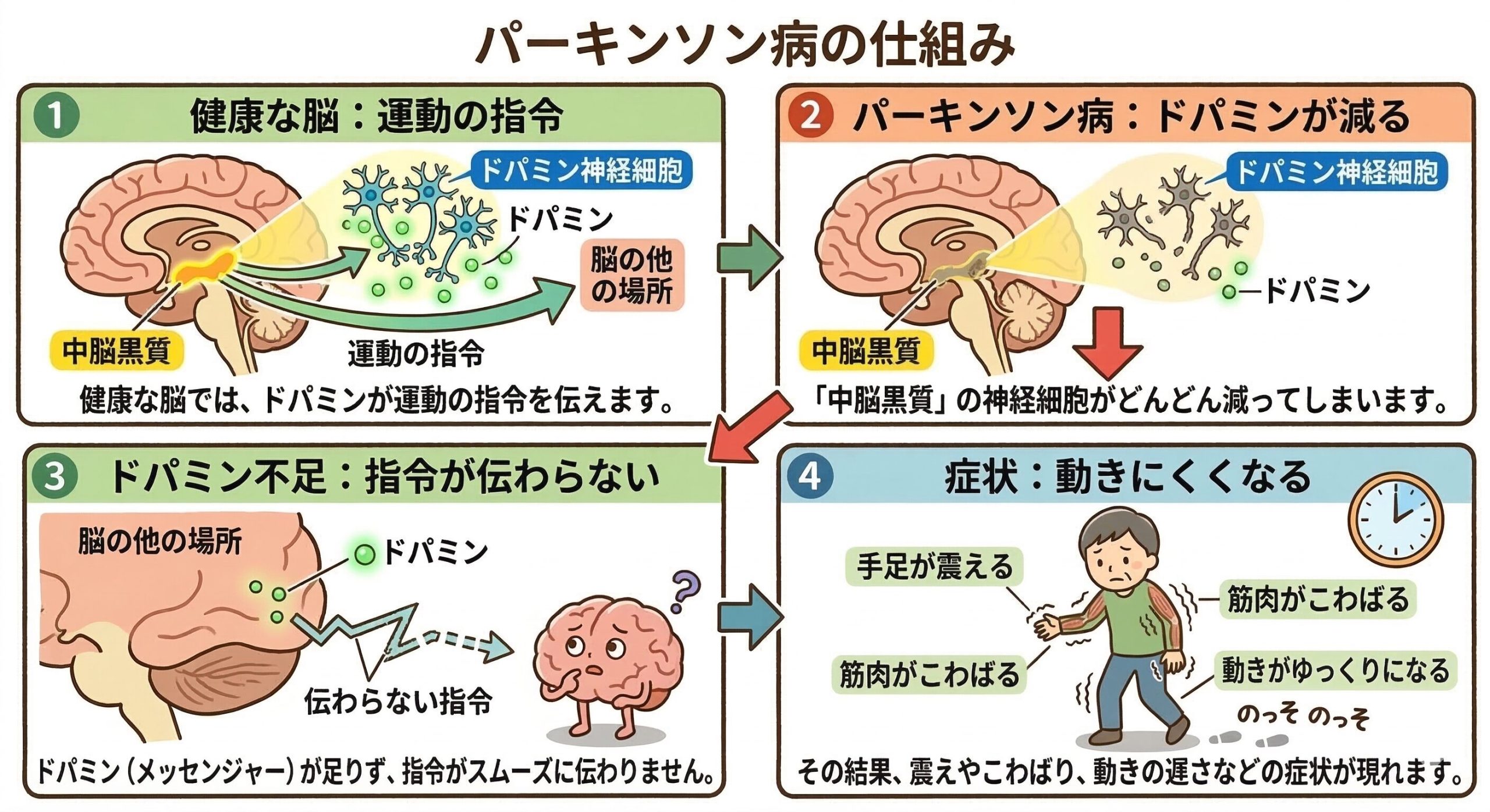 パーキンソン病は、手足が震えたり、筋肉がこわばったり、動きがゆっくりになったりする進行性の神経疾患だよ。 [Image of Parkinson’s disease dopaminergic neurons] 脳の中にある「中脳黒質(ちゅうのうこくしつ)」という場所で、運動の指令を伝えるドパミンを作り出す神経細胞(ニューロン)がどんどん減ってしまうことが原因なんだ。