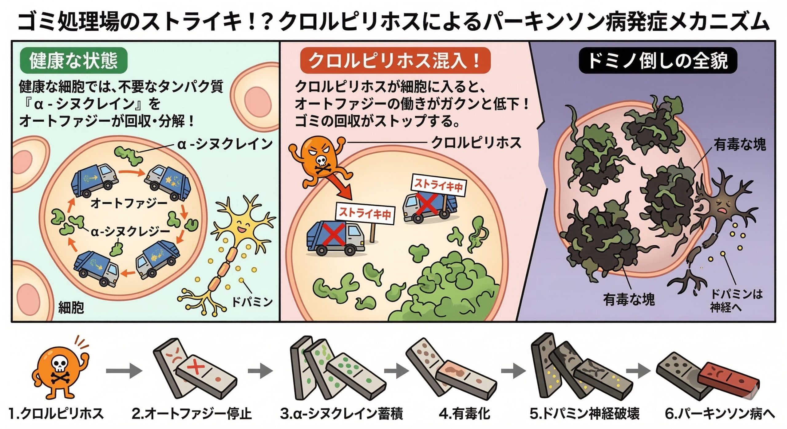 ゴミ処理システムがストライキを起こすとどうなるか?当然、細胞の中に不要なゴミ(α-シヌクレイン)がどんどん溜まっていくよね。やがてそれが有毒な塊になり、ドパミンを作り出すデリケートな神経細胞を内側から破壊してしまうんだ。これが、農薬がパーキンソン病を引き起こす一連のドミノ倒しの全貌だったんだよ!