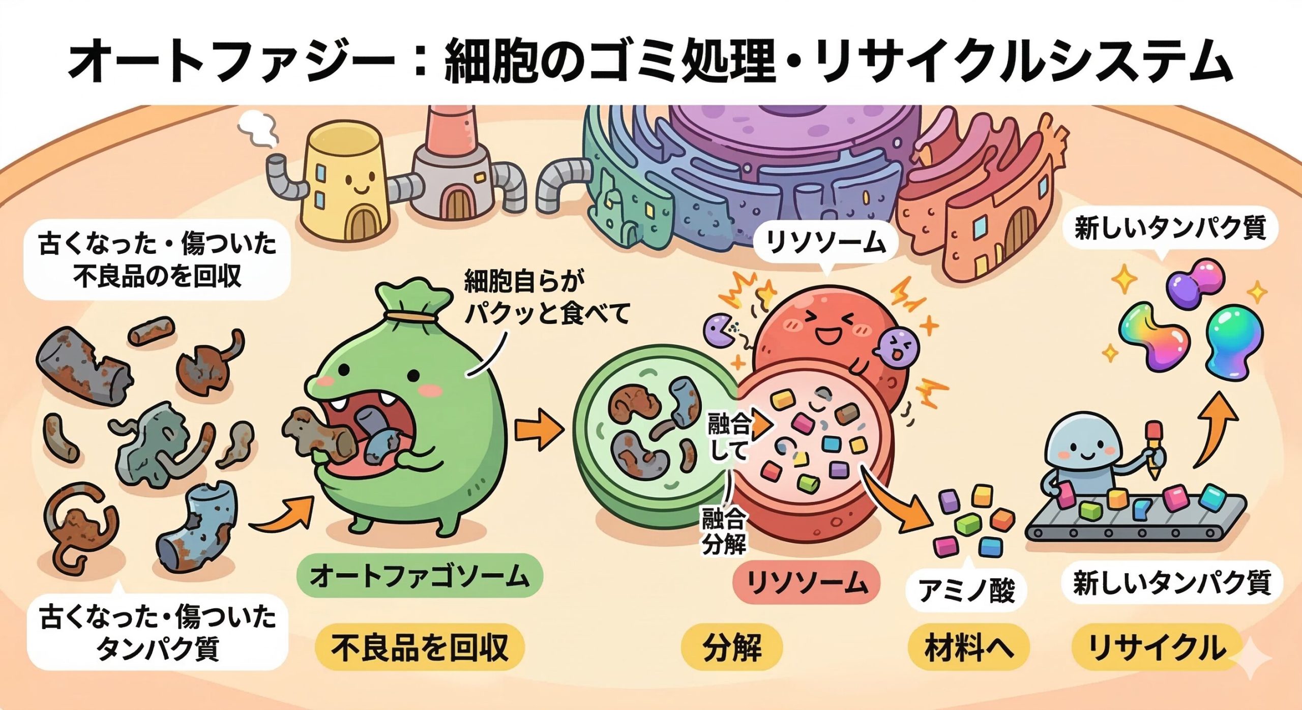 僕たちの体を作る細胞の中では、毎日たくさんのタンパク質が作られては壊されているよ。古くなったり傷ついたりした「不良品のタンパク質」を、細胞自らがパクッと食べて分解し、リサイクルするゴミ処理システム。それが「オートファジー」だよ。ノーベル賞を受賞した大隅良典先生の研究で有名だよね!