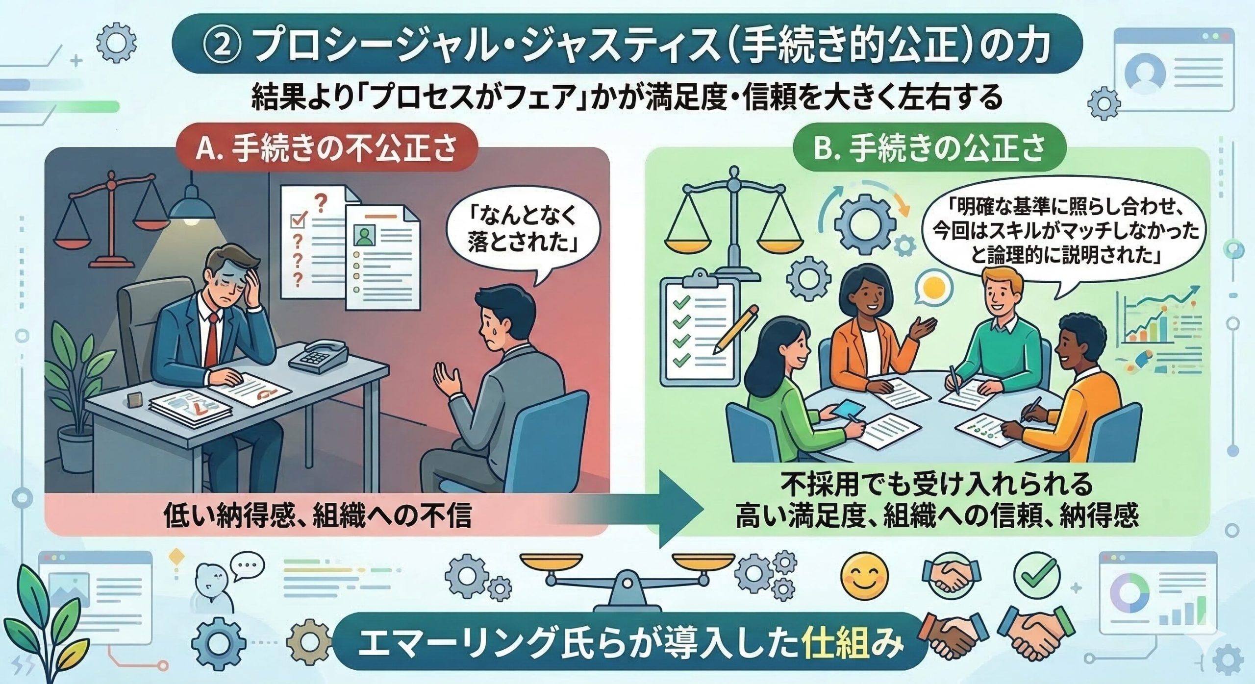 心理学には「手続き的公正(Procedural Justice)」という概念があるよ。これは、「結果そのもの(採用か不採用か)」よりも、「その結果に至るまでのプロセスがフェアだったか」のほうが、人々の満足度や組織への信頼に大きく影響するという法則なんだ。