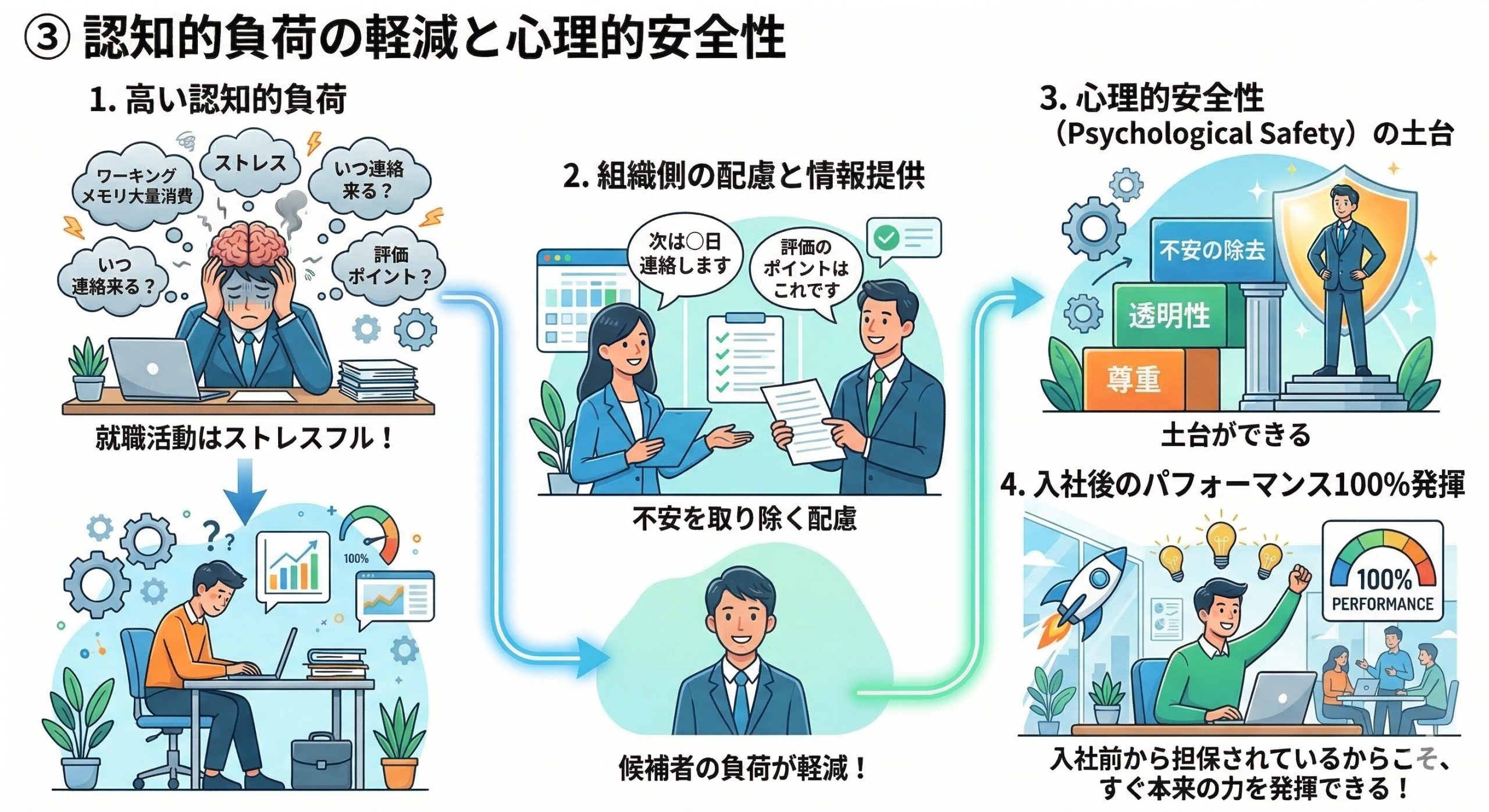 就職活動や新しいチームに入るためのオーディションって、めちゃくちゃストレスがかかるよね。脳のワーキングメモリを大量に消費する(認知的負荷が高い)状態なんだ。そんな中で、組織側が「次はいつ連絡します」「評価のポイントはこれです」と見通しを立ててあげると、候補者の脳はスッと安心できる。