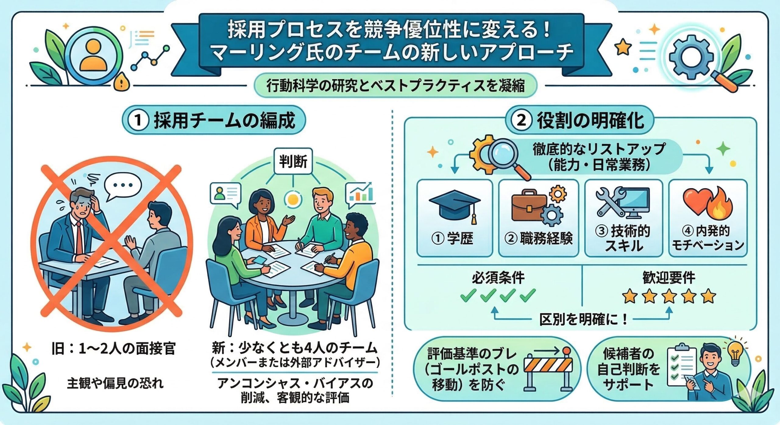 まず、1人や2人の面接官だけで決めるのをやめたんだ。「少なくとも4人のチームメンバー、または外部のアドバイザー」で評価チームを編成するルールにしたんだよ。これにより、1人の面接官の偏見や「なんとなく好き・嫌い」という主観(アンコンシャス・バイアス)が結果を左右するのを防ぐ狙いがあるんだ。