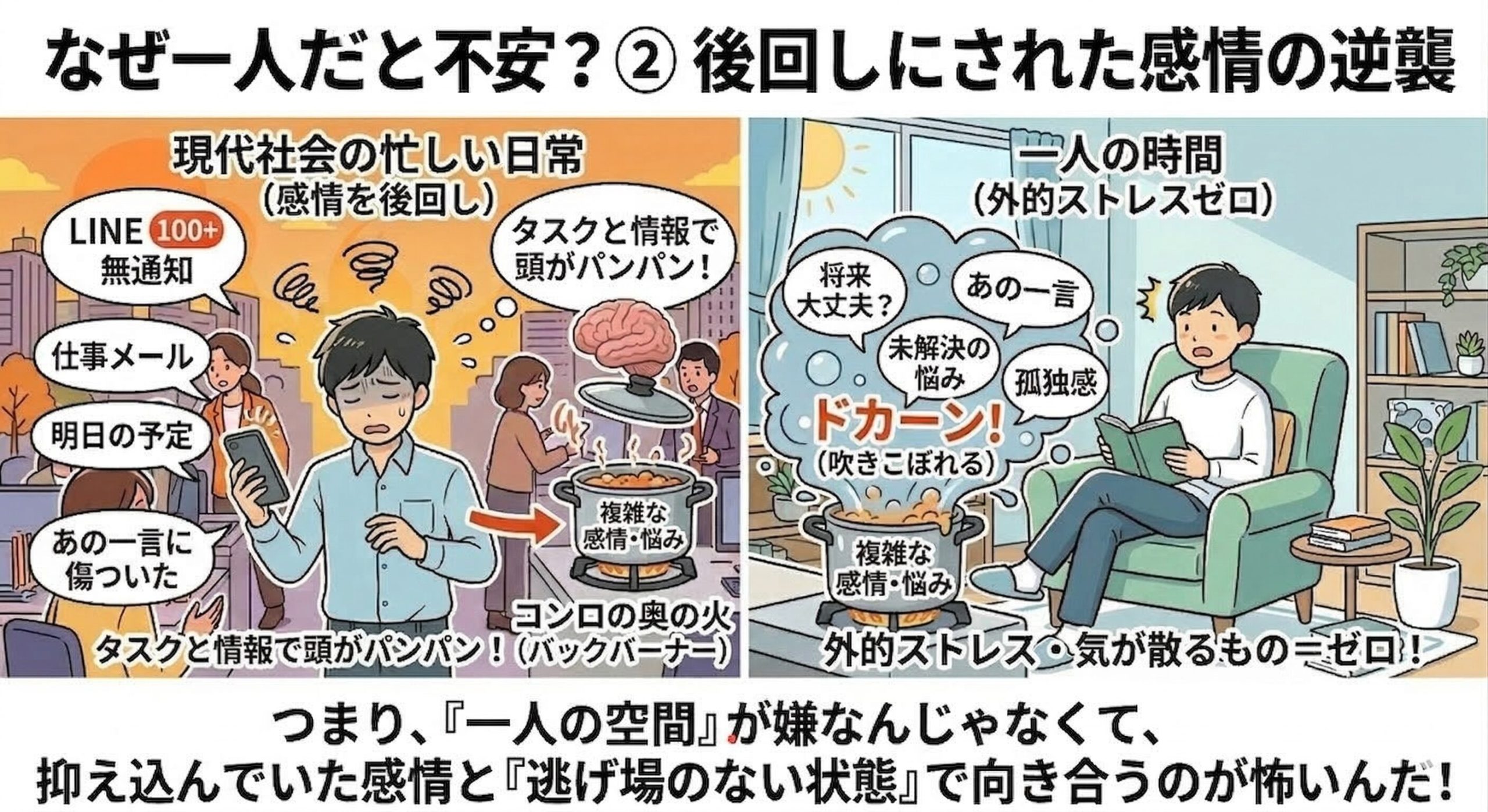 そして、いざ一人の時間ができて「外的ストレス」や「気を散らすもの」がゼロになった瞬間……ドカーン!コンロの奥でグツグツ煮詰まっていた感情や未解決の悩みが、一気に吹きこぼれて押し寄せてくるんだよ!研究者によると、これが「一人が苦痛」になる最大の原因なんだ。「一人の空間」が嫌なんじゃなくて、「抑え込んでいた自分の生々しい感情と、逃げ場のない状態で向き合うのが怖い(不快だ)」ってことなんだね。