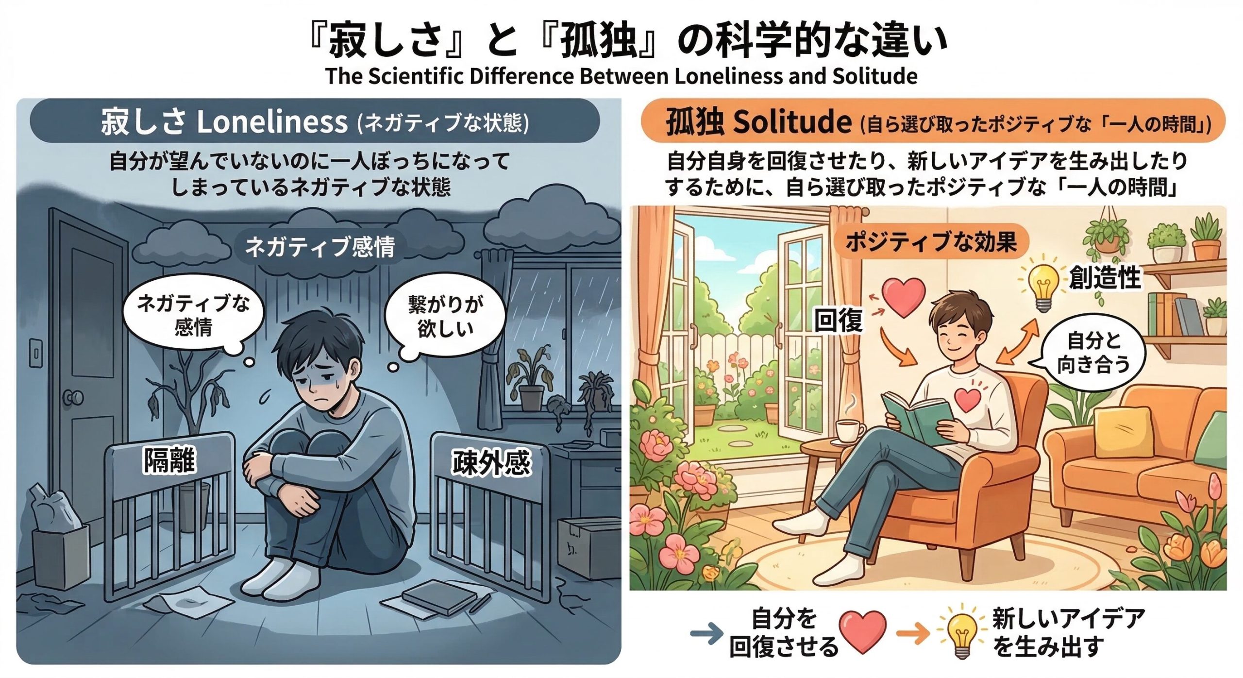 科学的な定義では、「寂しさ(Loneliness)」っていうのは、自分が望んでいないのに一人ぼっちになってしまっているネガティブな状態のこと。一方で「孤独(Solitude)」は、自分自身を回復させたり、新しいアイデアを生み出したりするために、自ら選び取ったポジティブな「一人の時間」のことなんだ。