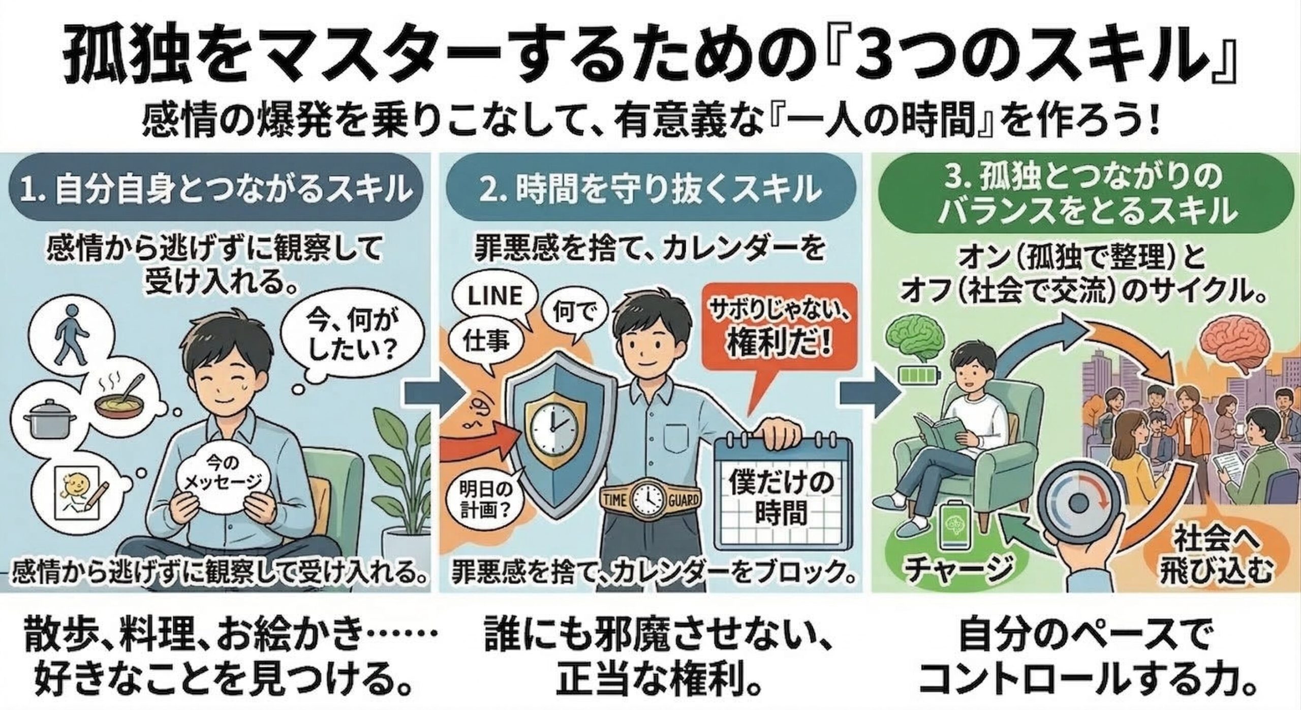 そこで研究者たちは、この「感情の爆発」を乗りこなして、有意義な「一人の時間」を作り出すための具体的な3つのスキルを提唱しているよ!これを知っていれば、キミも孤独の達人になれちゃうかも!