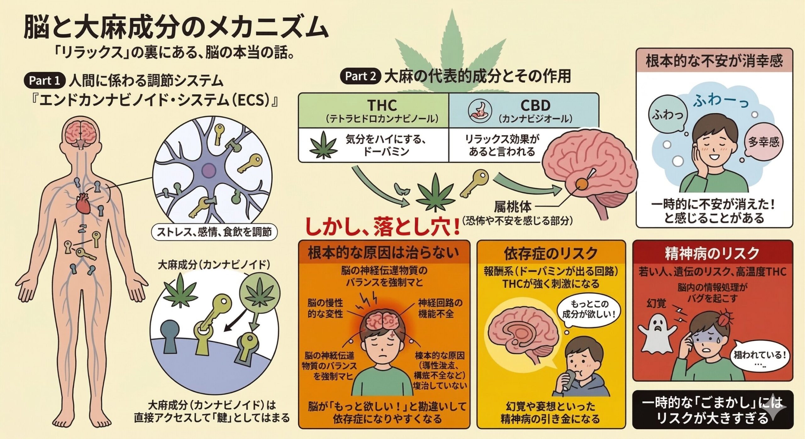 • 一時的にリラックスできたと感じても、根本的な治療にはなっておらず、逆に精神病や依存症のリスクを高めちゃう可能性があるんだ。