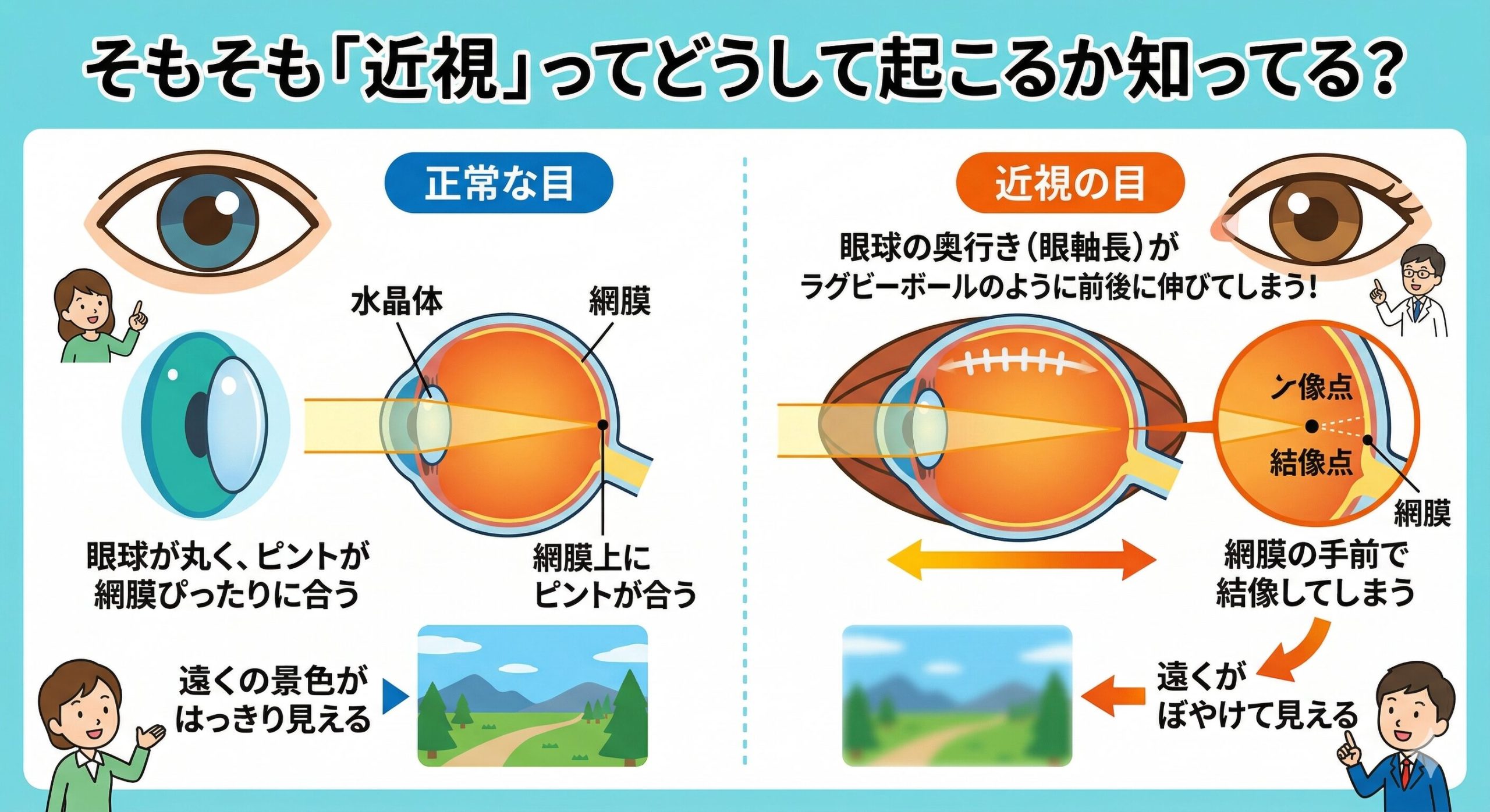 まず、そもそも「近視」ってどうして起こるか知ってるかな?単に「ピントが合わない」だけじゃないんだ。多くの近視は、眼球の奥行き(眼軸長)がラグビーボールのように前後に伸びてしまうことで起こるんだよ。眼球が伸びちゃうと、レンズ(水晶体)を通った光が網膜の手前で結像しちゃうから、遠くがぼやけて見えるんだね。