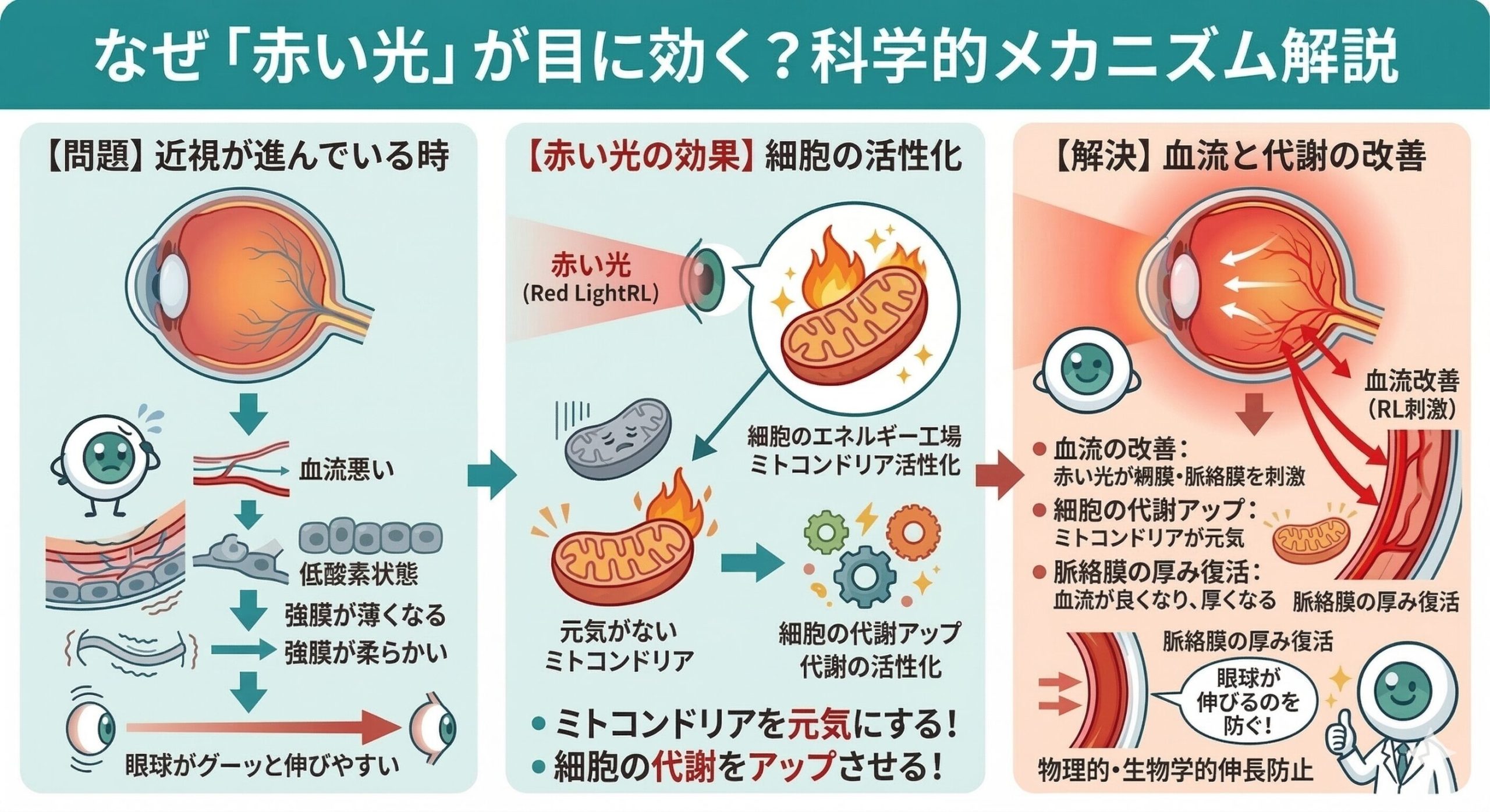 - 血流の改善:赤い光が網膜や脈絡膜を刺激することで、血流が増える。