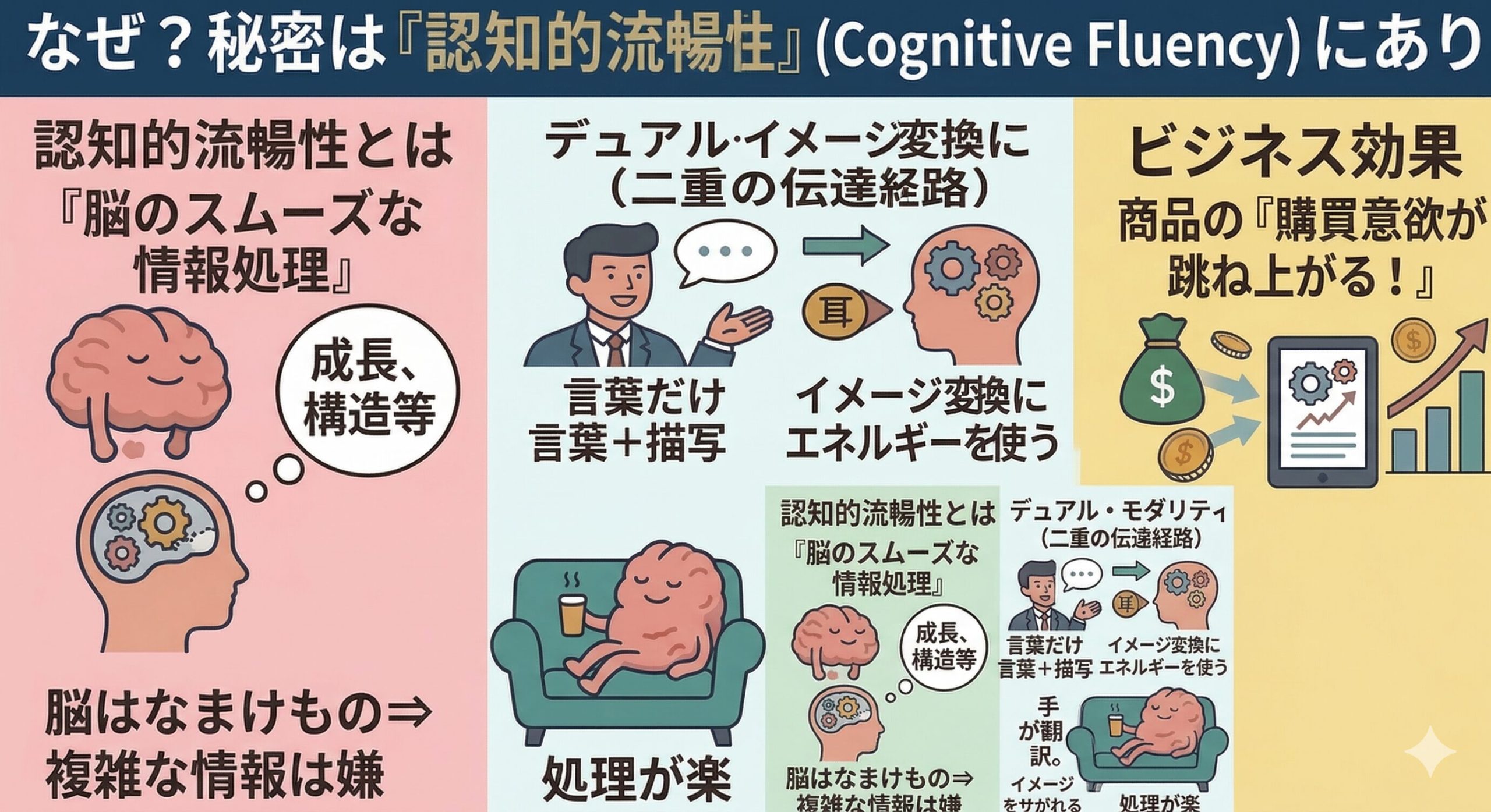 じゃあ、なんで「イラストレーター」のジェスチャーだけが、こんなに人の心を動かす魔法のスイッチになるんだろう?その秘密は、僕たちの脳の働きである「認知的流暢性(Cognitive Fluency)」というメカニズムに隠されているんだ!ここからがサイエンスの面白いところだよ!