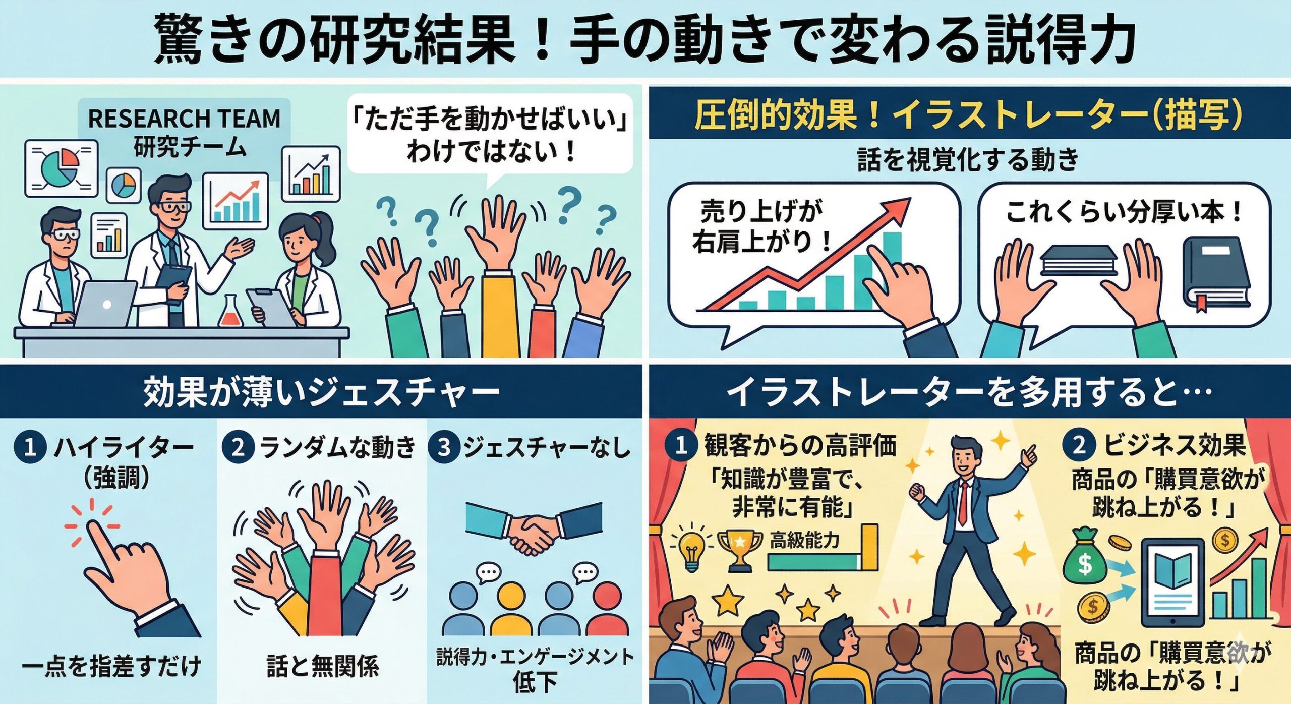 でも、「イラストレーター(描写)」のジェスチャーは別格だった!例えば、「売り上げがこんなに右肩上がりで!」と言いながら手で上向きのカーブを描いたり、「これくらい分厚い本で…」と両手で厚みを示したりする動きのことだよ。このイラストレーターを多用する話し手は、観客から「知識が豊富で、非常に有能である」と高く評価され、商品の購買意欲も跳ね上がったんだ!