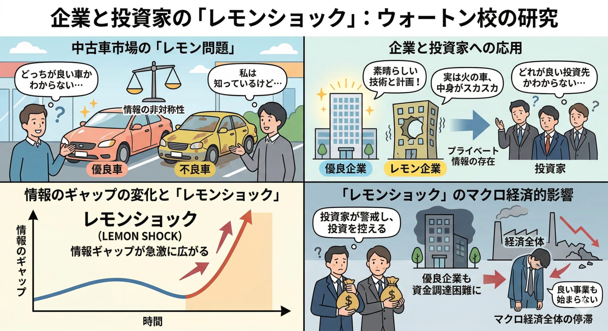 最近、アメリカの超名門・ペンシルベニア大学ウォートン校の研究チームが、この「レモン」が引き起こすショックが、僕たちの社会の投資や経済成長にどれだけ大ダメージを与えているかを示す、めちゃくちゃ面白い研究を発表したんだ。なんと、金融危機レベルの大不況を引き起こす原因の大きな部分が、この「レモンショック」で説明できちゃうらしいんだよ!それじゃあ、さっそくこのワクワクする研究の中身を深掘りしていこう!
