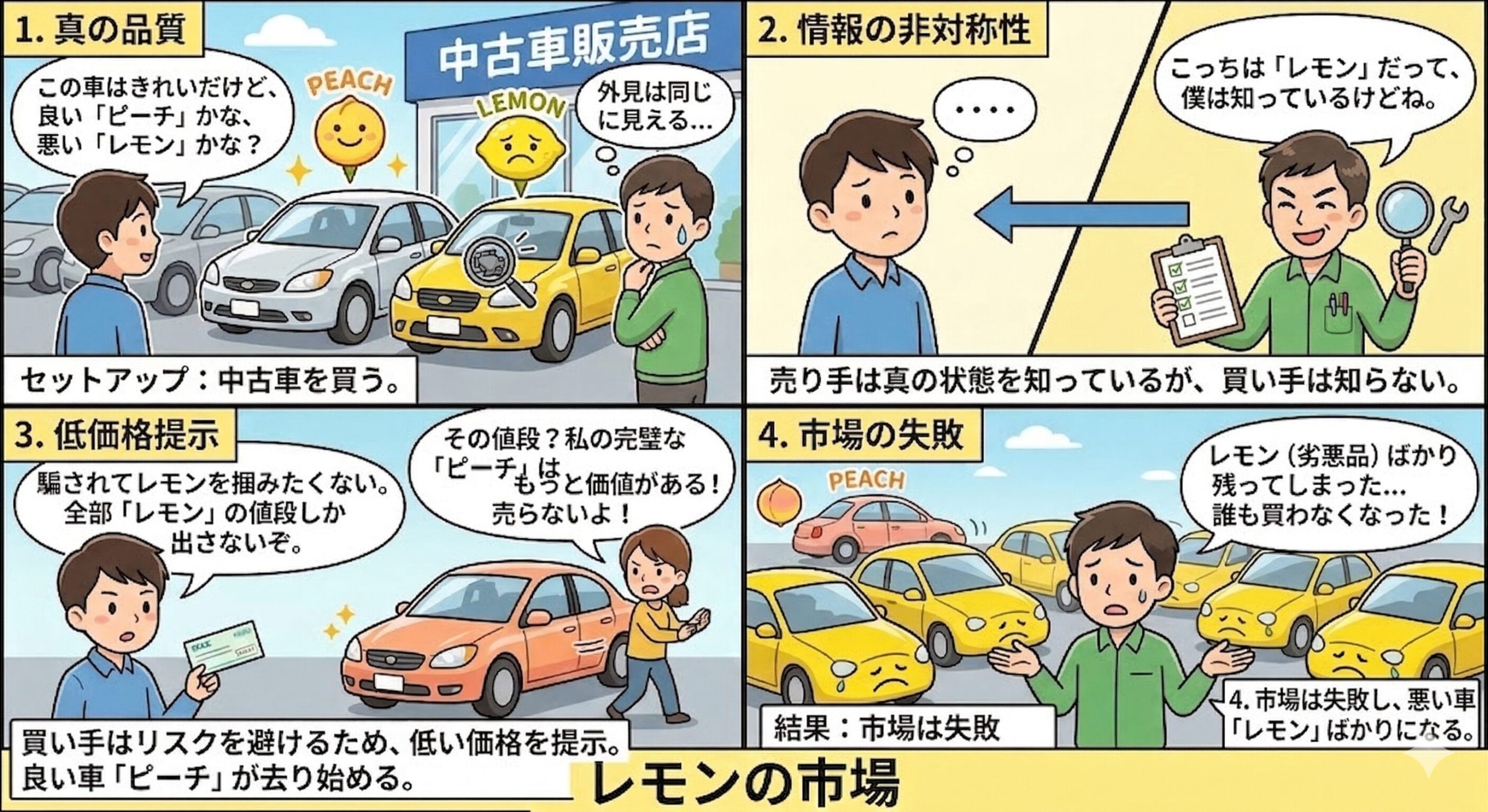 たとえば、キミが中古車を買おうとしているとするよね。お店にはピカピカの車が並んでいるけど、本当にエンジンが絶好調な「ピーチ(優良品)」なのか、すぐ故障しちゃう「レモン(不良品)」なのか、パッと見じゃ全然わからない。でも、売る側のお店(または元の持ち主)は、その車がレモンかどうかを完全に知っているよね。これを、専門用語で情報の非対称性って呼ぶんだ。