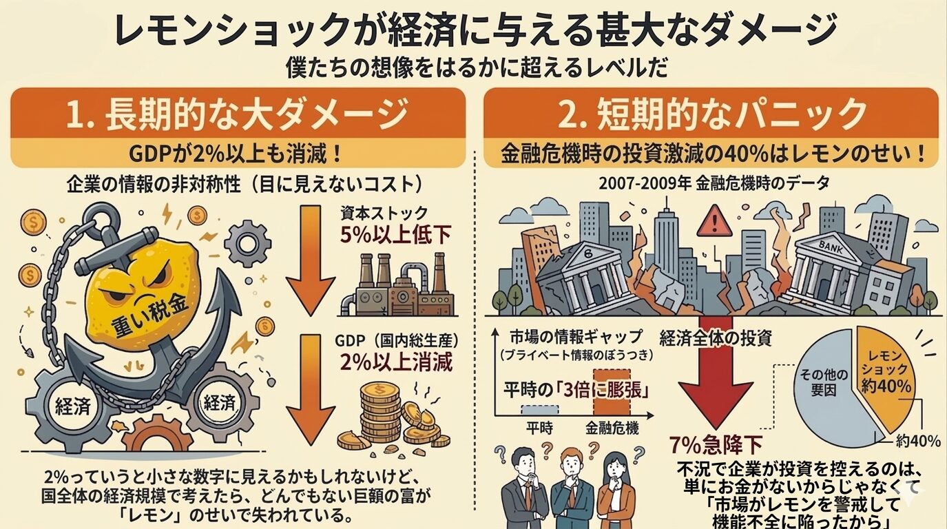 このとき発生した巨大な「レモンショック」によって、経済全体の投資が7%も急降下したんだけど、驚くべきことに、この時期の投資全体の落ち込みの約40%が、この「レモンショック」だけで説明できちゃうんだって!不況で企業が投資を控えるのは、単にお金がないからじゃなくて、「市場がレモンを警戒して機能不全に陥っていたから」というのが大きな理由だったんだね。
