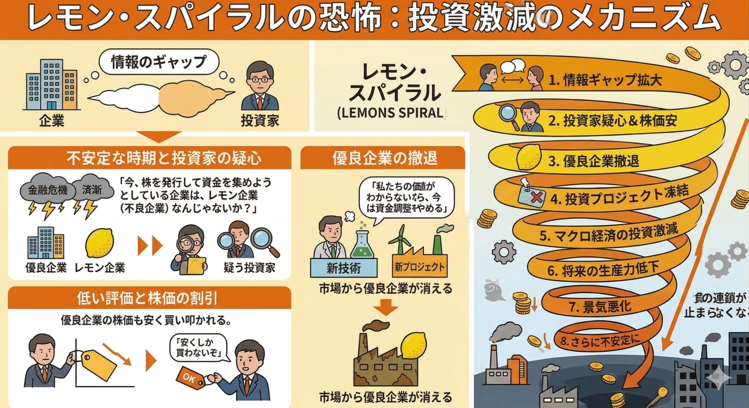 その結果、市場から優良企業が資金調達を引き揚げてしまい、社会を変えるかもしれない素晴らしい投資プロジェクトにお金が回らなくなる。これがマクロ経済全体での「投資の激減」を引き起こし、将来の生産力が落ちて、さらに景気が悪くなる……。研究チームはこれを「レモンのスパイラル(lemons spiral)」と呼んでいるんだ。負の連鎖が止まらなくなる、本当に恐ろしい現象だよね。