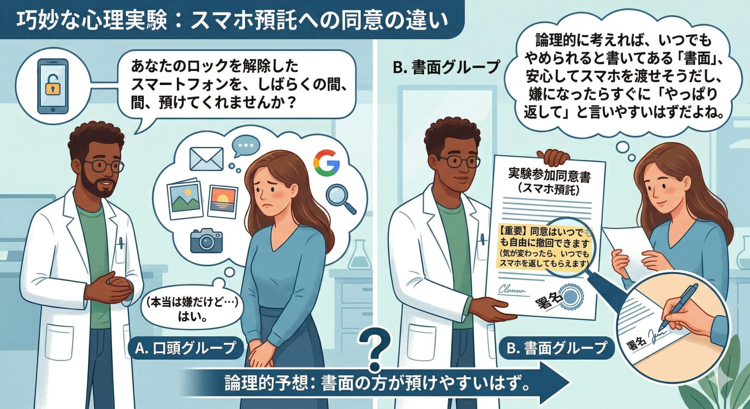 さらに、書面の実験ではすごく重要な工夫がされていたんだ。書面の中には「同意はいつでも自由に撤回できます(気が変わったら、いつでもスマホを返してもらえます)」とはっきりと明記したんだよ。論理的に考えれば、いつでもやめられると書いてある「書面」の方が、安心してスマホを渡せそうだし、嫌になったらすぐに「やっぱり返して」と言いやすいはずだよね。さあ、キミならどういう結果になると思う?