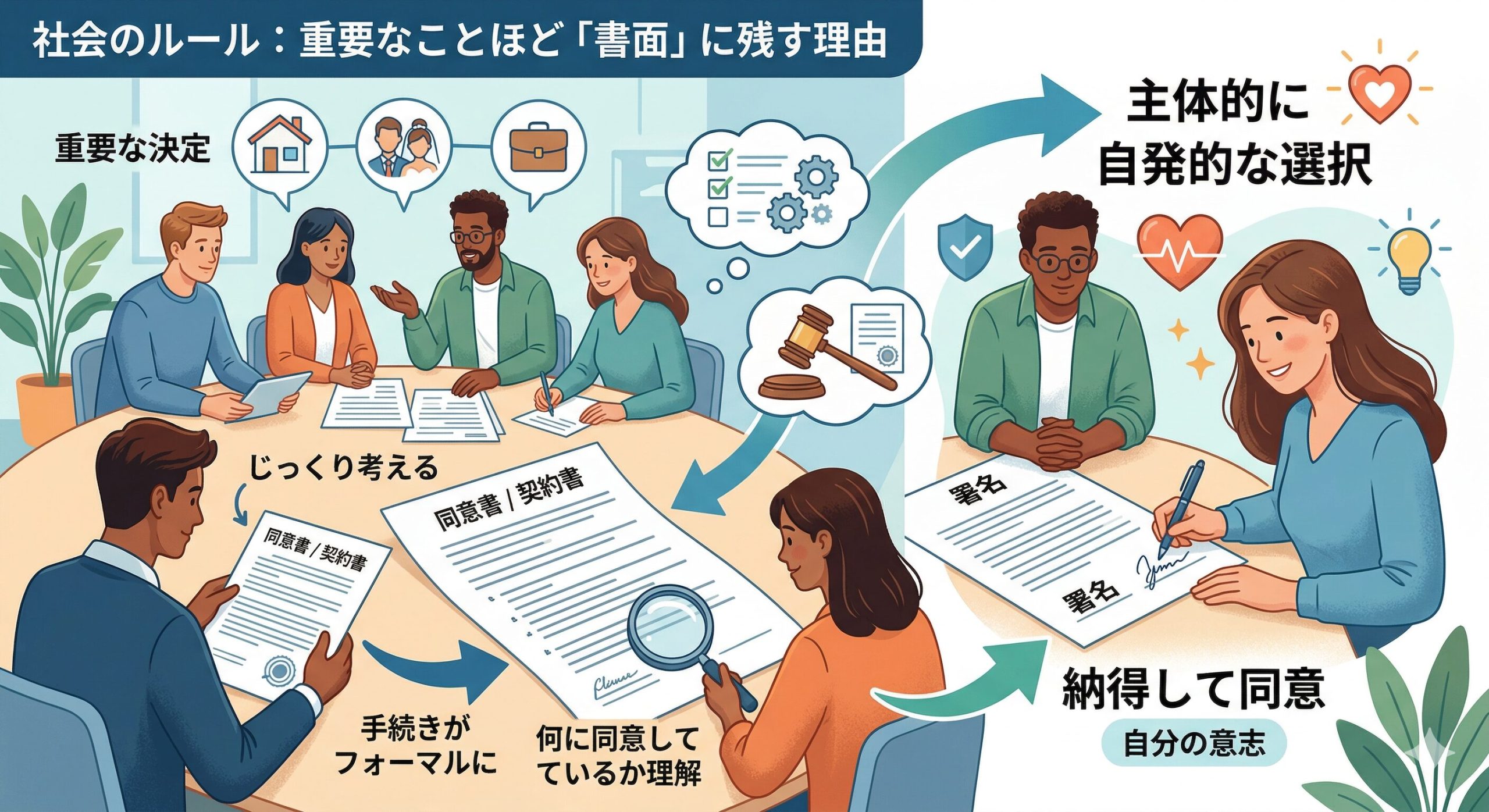 社会のルールとして、重要なことほど「書面」に残すのが当たり前になっているよね。これは、書面にすることで手続きがフォーマルになり、みんなが「自分が何に同意しているのか」をじっくり考えて、主体的に(マインドフルに)自発的な選択ができると信じられてきたからなんだ。