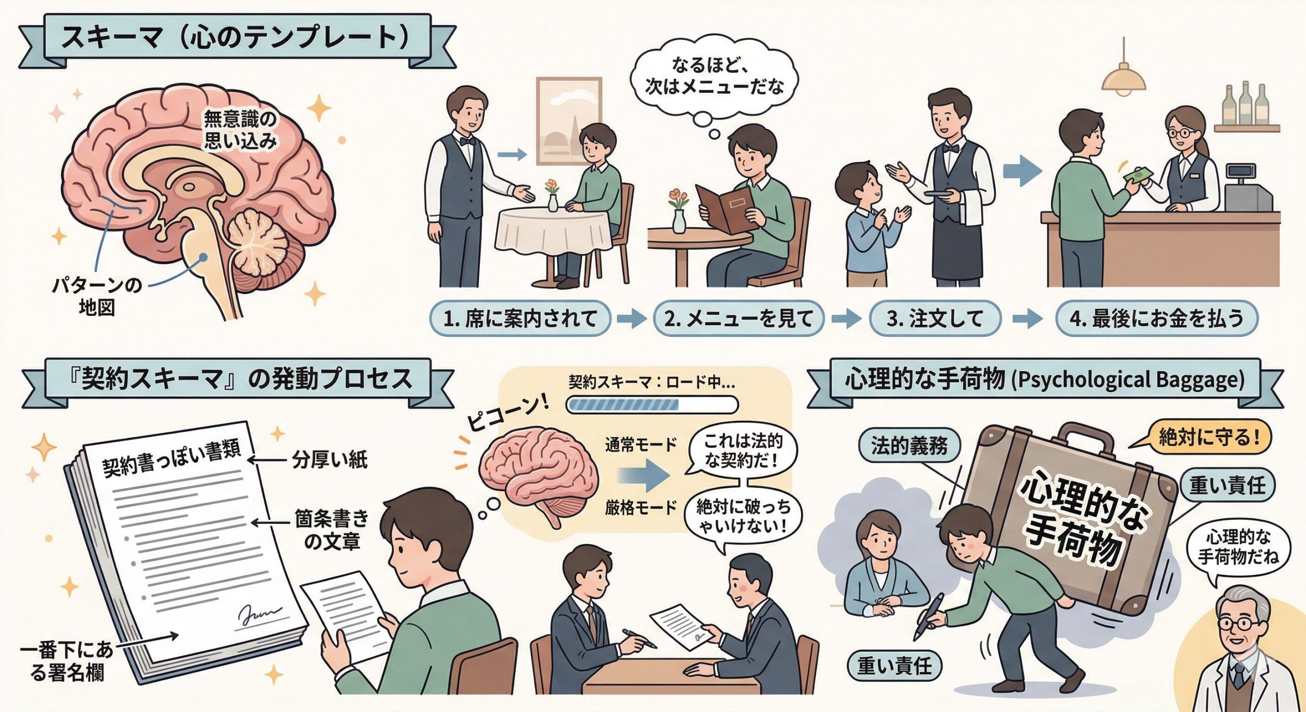 「スキーマ」っていうのは、僕たちの脳の中にある「こういう時はこうなるはずだ」という無意識の思い込みや、パターンのこと。例えば「レストラン」というスキーマが働くと、「席に案内されて、メニューを見て、注文して、最後にお金を払う」という一連の流れを無意識に予測するよね。これと同じで、僕たちの脳内には「契約書っぽい書類」を見た時に発動する「契約スキーマ」が存在するんだ。
