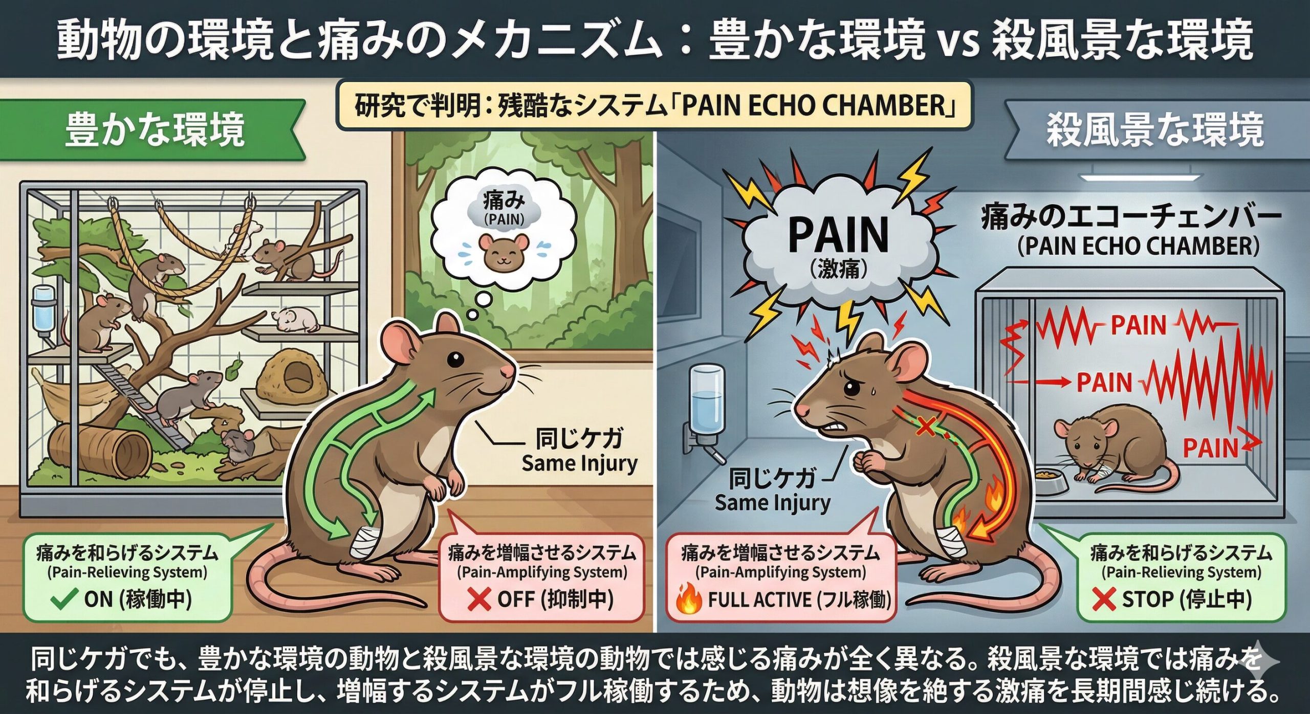 今回は、殺風景な環境が動物たちから痛みを和らげる力を奪い、逆に苦しみを増幅させてしまう「痛みのエコーチェンバー」について解説したよ。