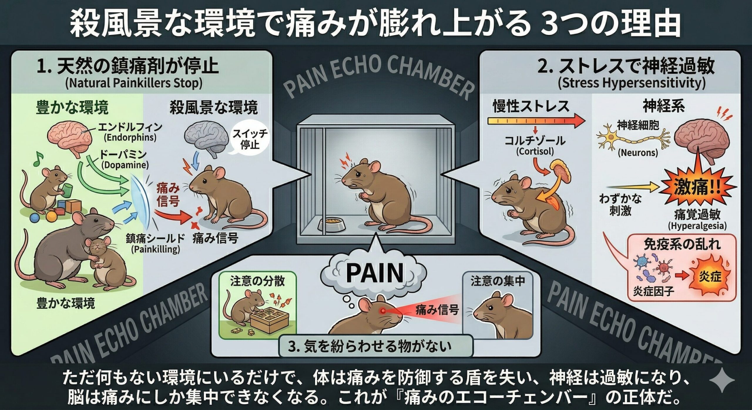 ここが科学的に一番重要なポイントだよ。なぜ、ただ「何もない環境」にいるだけで、痛みが何倍にも膨れ上がってしまうのか。そのメカニズムには、大きく分けて3つの理由があることがわかったんだ。一緒に順を追って見ていこう。