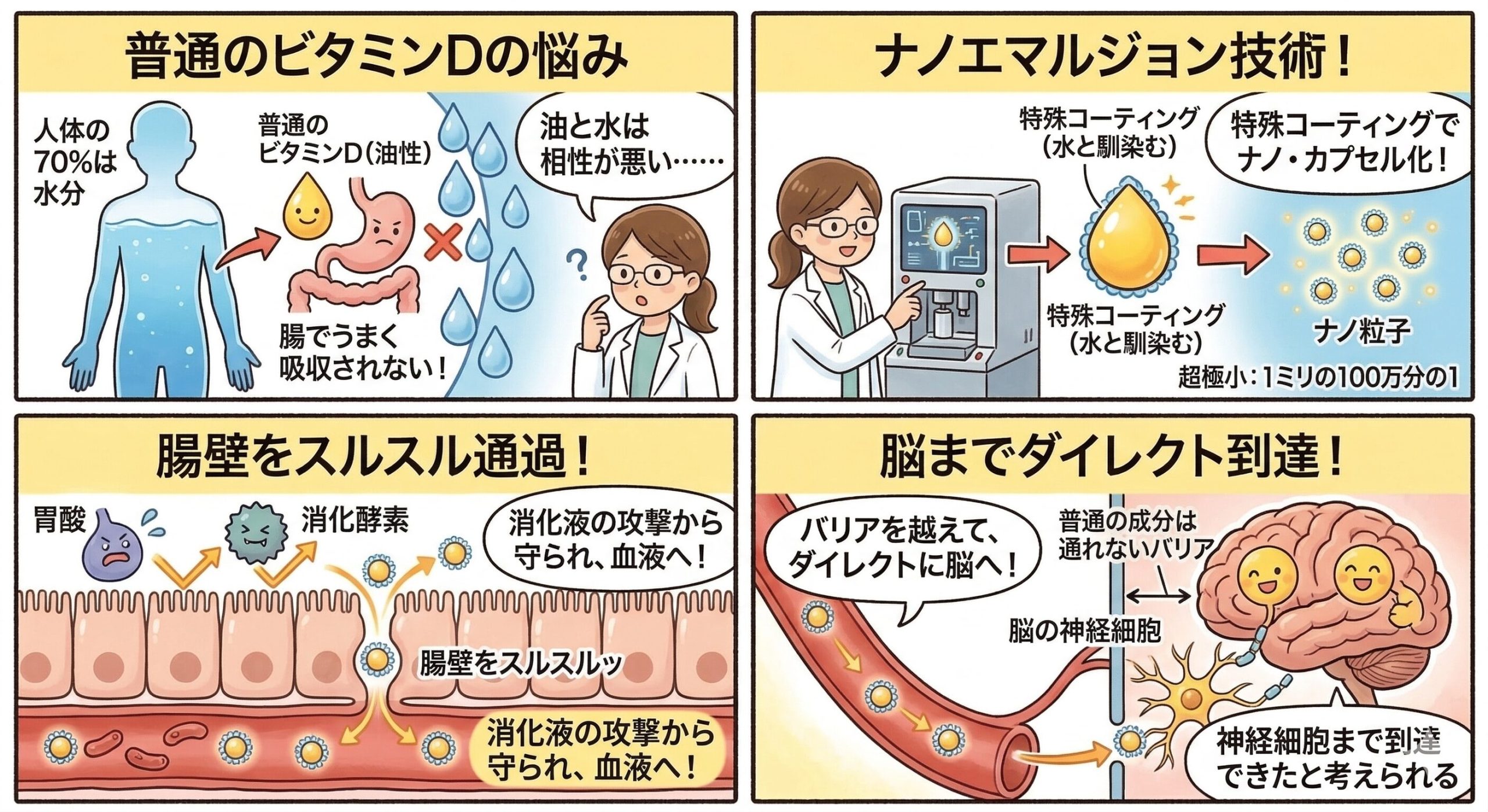 さっきも言った通り、普通のビタミンDは油の性質を持っているから、人間の体の70%を占める「水分」とは相性が悪くて、腸でうまく吸収されないんだよね。そこで登場するのがナノエマルジョン技術だよ。
