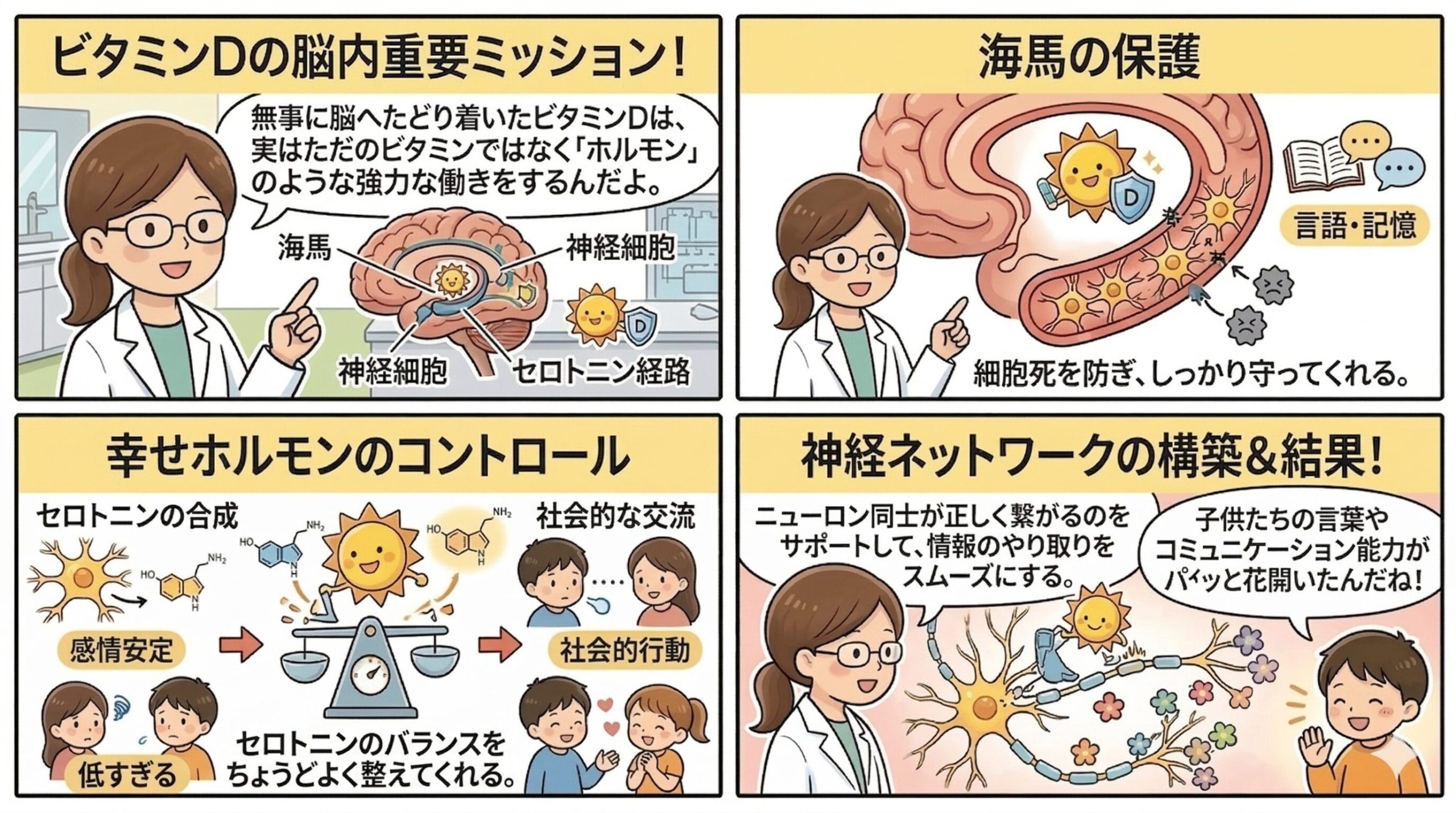 無事に脳へたどり着いたビタミンDは、実はただのビタミンではなく「ホルモン」のような強力な働きをするんだよ。特に重要なのが以下のポイント!