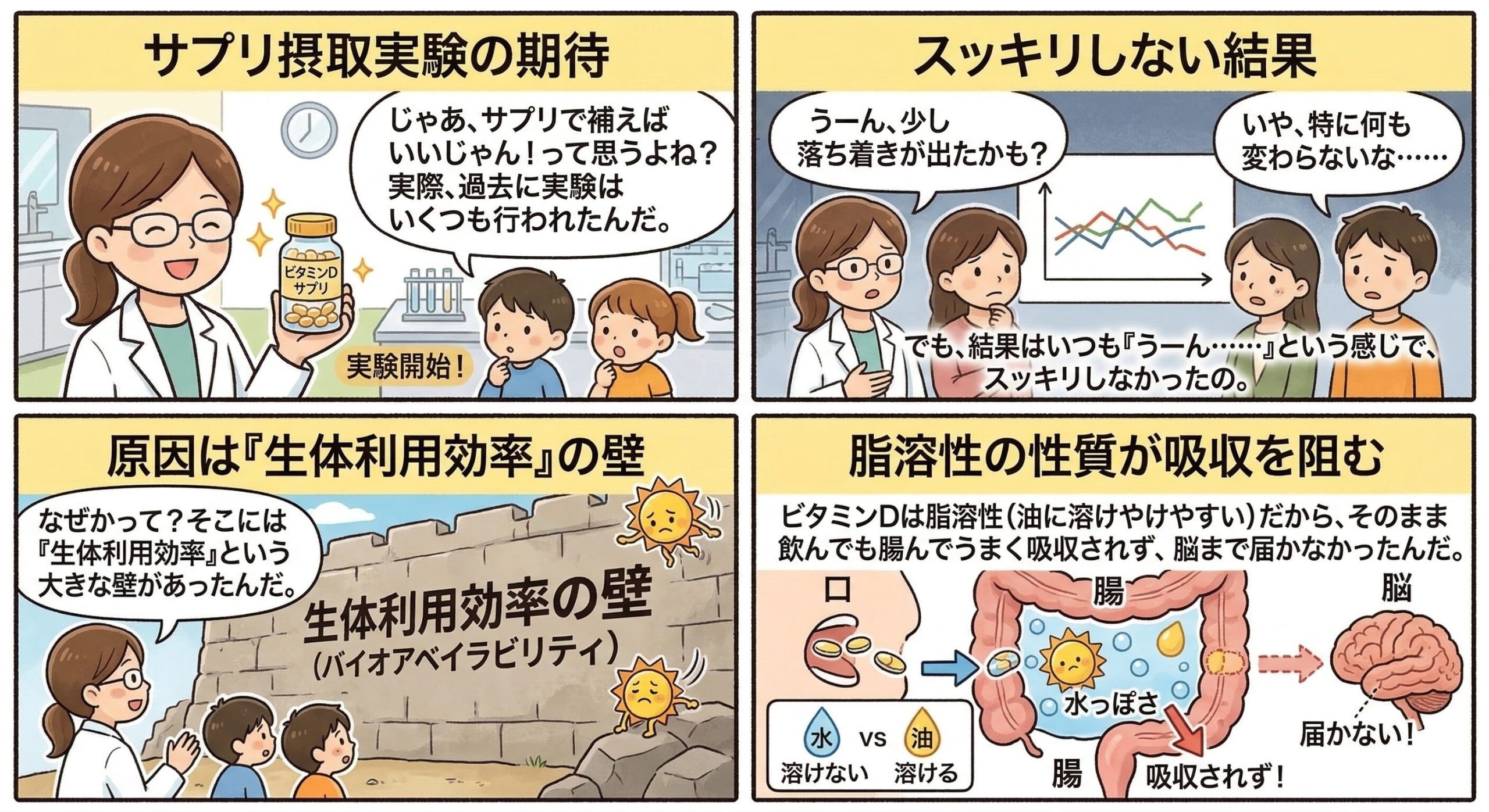 じゃあ、足りないならサプリで補えばいいじゃん!って思うよね?実際、過去にもASDの子供たちにビタミンDサプリを飲んでもらう実験はいくつも行われてきたんだ。でも、結果はいつも「うーん、少し落ち着きが出たかも?」「いや、特に何も変わらないな……」という感じで、スッキリしないものばかりだったの。