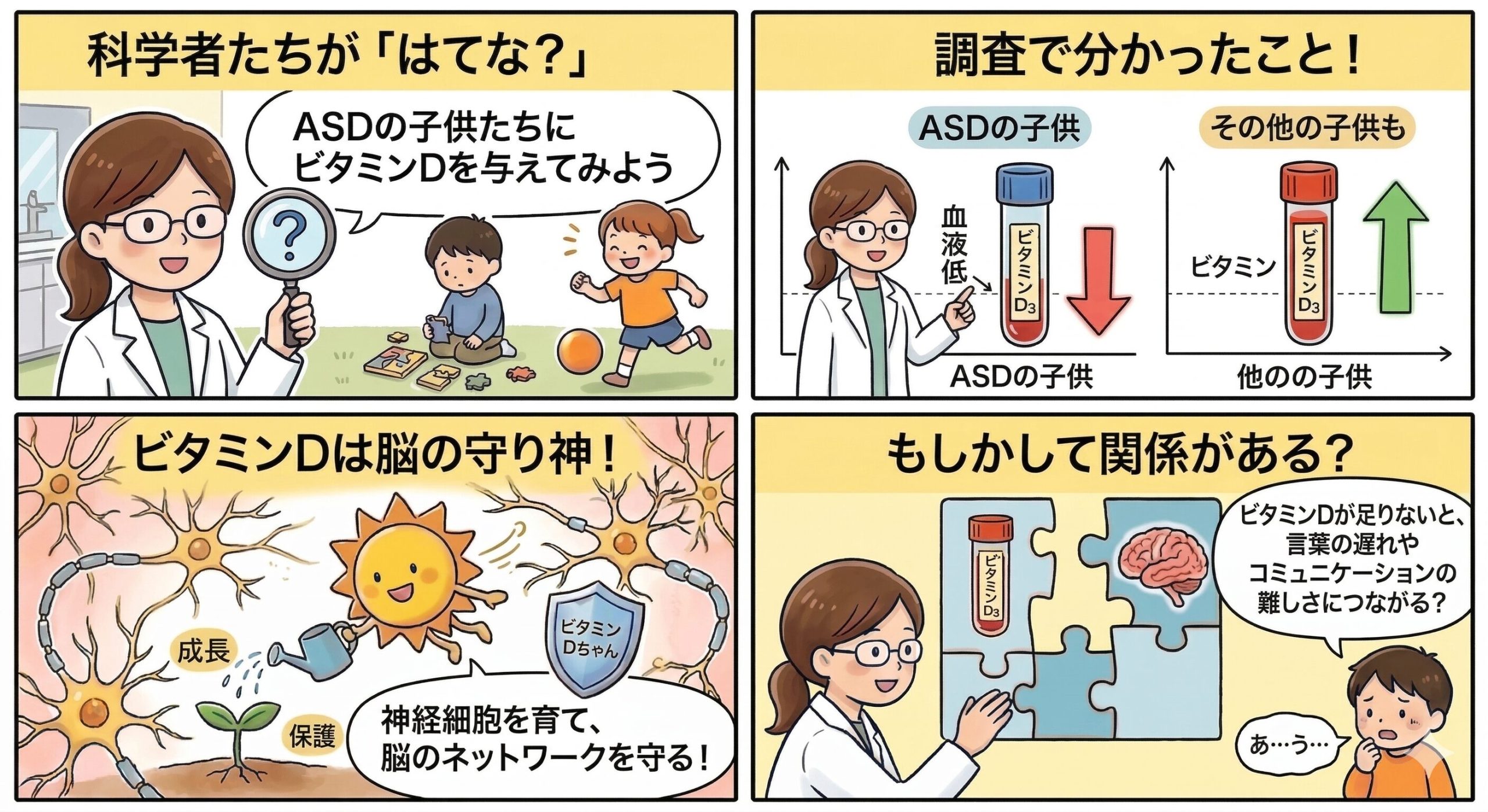 実は、これまでのさまざまな調査から、ASDの子供たちは、そうでない子供たちに比べて血液中のビタミンD3濃度が著しく低い傾向があるってことが分かっていたんだ。ビタミンDは、神経細胞を育てたり、脳のネットワークを保護したりする役割を持っているから、「ビタミンDが足りないことが、言葉の遅れやコミュニケーションの難しさに関係しているんじゃないか?」って長年考えられてきたんだよね。
