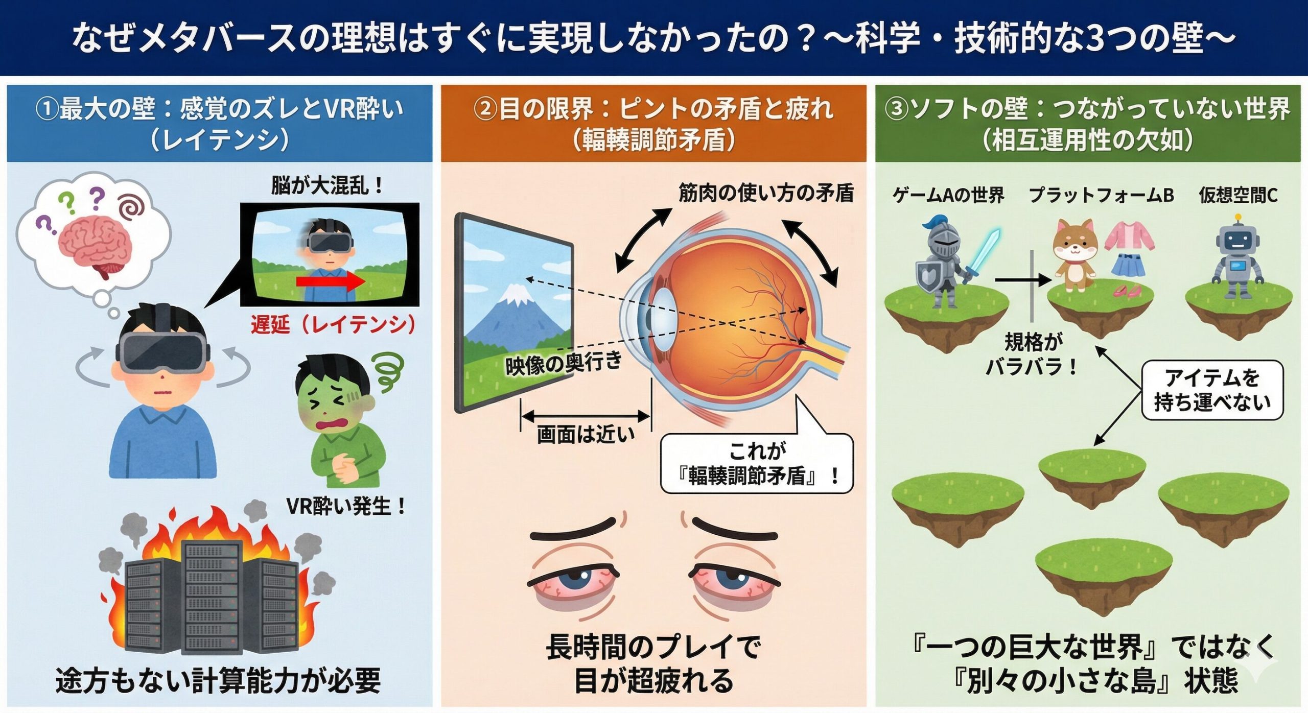 じゃあ、なぜ最初のメタバースの理想はすぐには実現しなくて、今は別の形で進化しているんだろう?ここには、とっても面白い科学的・技術的なハードルがあるんだ!