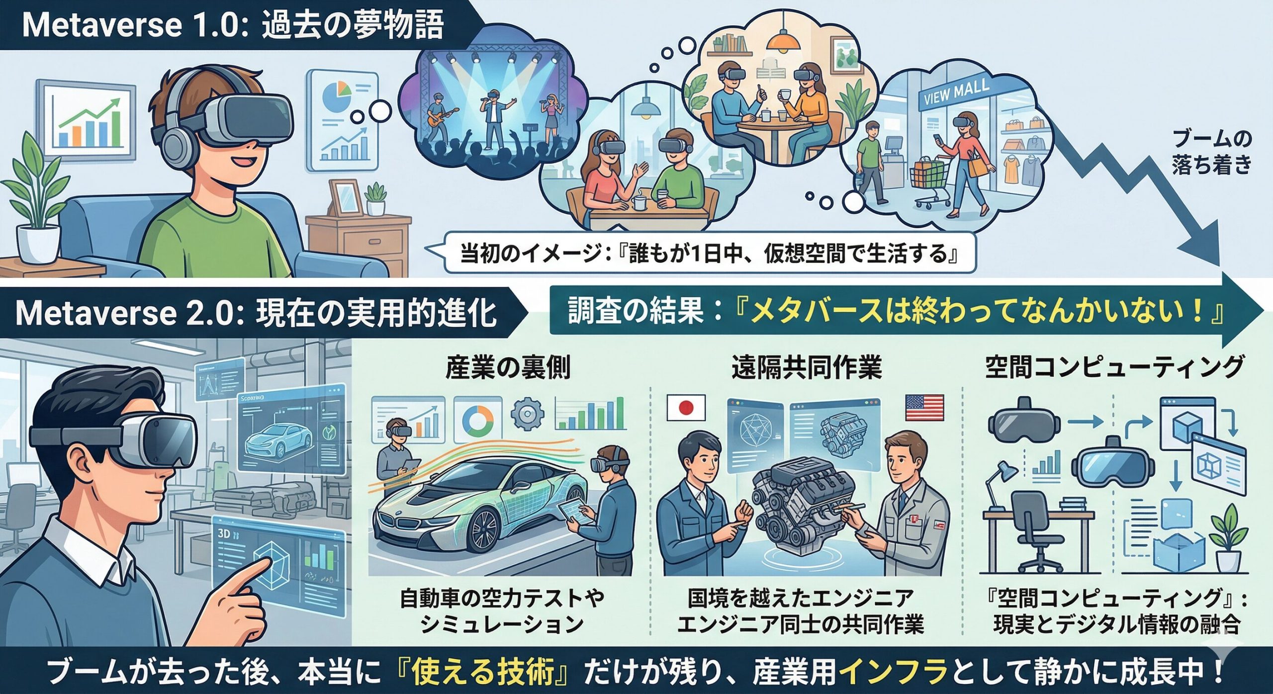 たしかに「誰もが1日中、仮想空間で生活する」という当初の夢物語はいったん落ち着いたかもしれない。でも、その代わりに起きているのは、もっと現実的で実用的な形への進化だったんだ。企業は仮想空間を「生活する新しい世界」から、「現実の作業をサポートする強力なツール」へと位置付けを変えているんだよ。