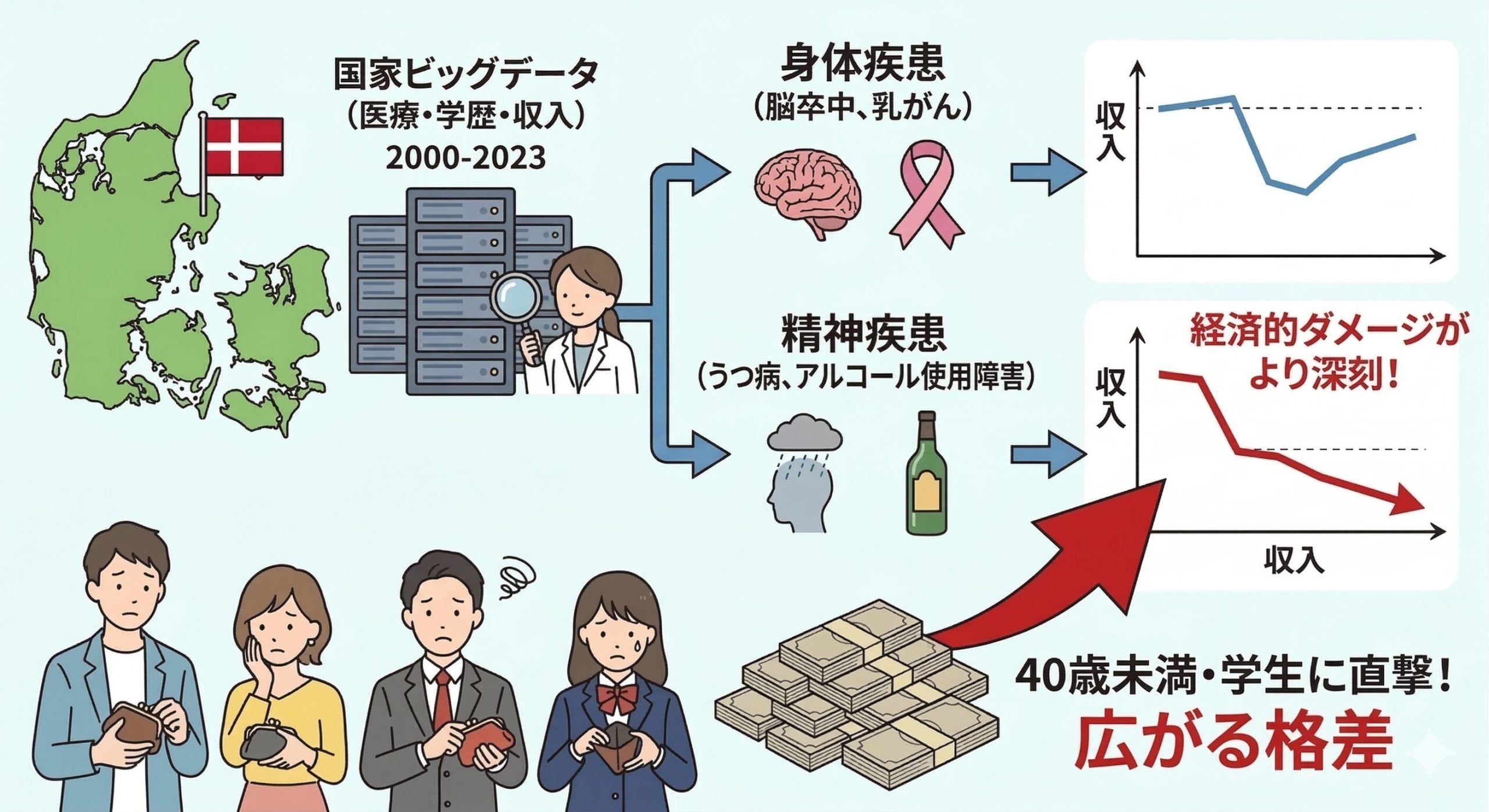 調査の結果、明らかになった事実はかなりシビアなものだったよ。評価された4つの病気すべてにおいて、健康な人と比べて実質的な収入の減少が確認されたんだけど、特に注目すべきは、身体の病気よりも、心の病気のほうが長期的な収入の損失が大きかったということなんだ。