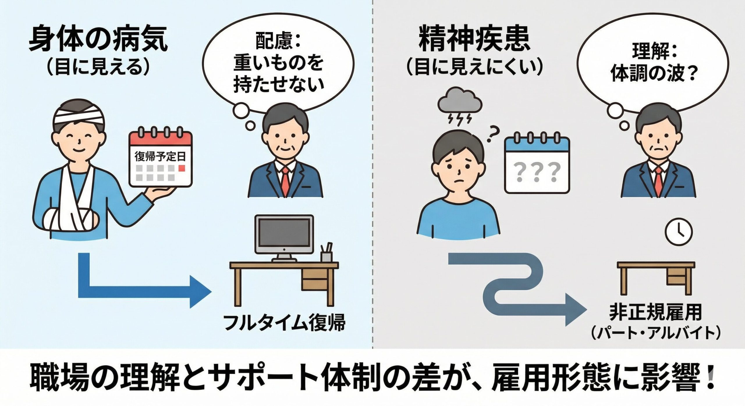 でも、精神疾患の場合はそうはいかない。回復したように見えても気分の波があったり、ストレスのかかる業務で急に体調を崩してしまったりと、「良くなったり悪くなったり」を繰り返すことが多いんだよね。さらに、症状が目に見えないため、周囲からの理解を得られにくく、結果としてフルタイムの仕事に戻れず、パートタイムやアルバイトといった非正規雇用に移行せざるを得ないケースが増えてしまうんだと考えられるよ。