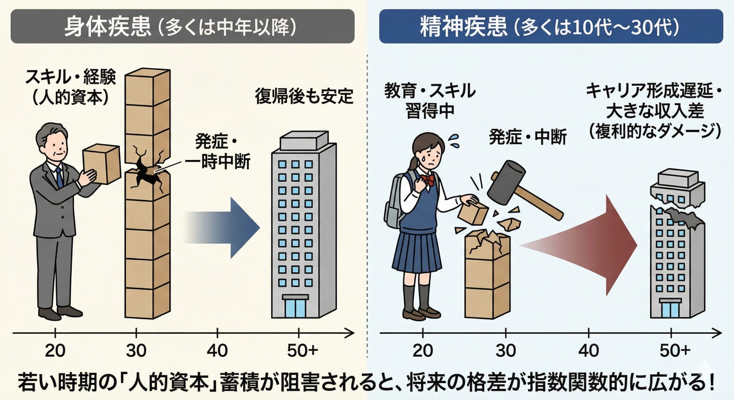 一方、うつ病やアルコール使用障害などの精神疾患は、10代から30代といった若い時期に発症するケースが非常に多いんだよ。経済学では、若い時期に教育を受けたり仕事のスキルを磨いたりすることを「人的資本の蓄積」と呼ぶんだけど、この一番大切な時期に病気でキャリアや学業が中断されてしまうと、その後の昇進や転職に圧倒的な不利が生じてしまう。これが、時間が経つほどに収入の差が広がっていく「複利的なダメージ」の正体なんだ。