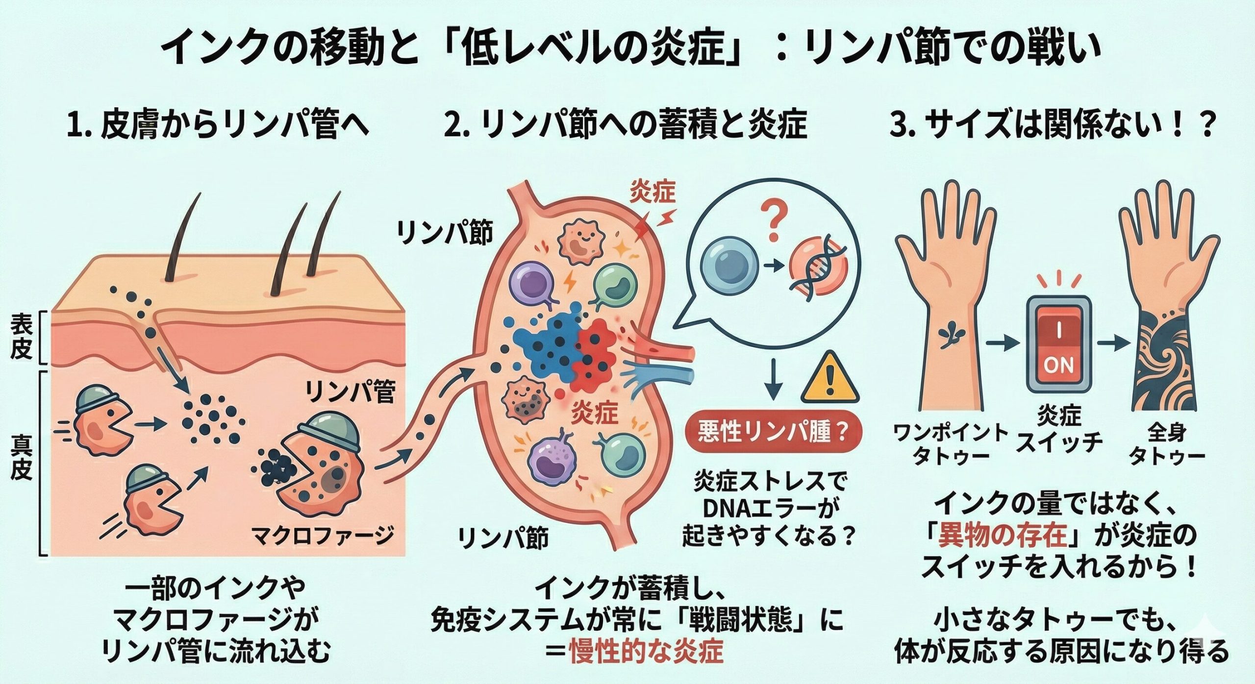 リンパ節に異物(インク)が蓄積し続けると、免疫システムは常に「微弱な戦闘状態」を維持することになる。これが「慢性的な低レベルの炎症」と呼ばれる状態だよ。細胞が常に炎症というストレスにさらされ続けると、細胞分裂のときにDNAのエラーが起きやすくなってしまうんだ。これがリンパ球のガン化(悪性リンパ腫)を引き起こすトリガーになっているんじゃないか、と推測されているんだね。