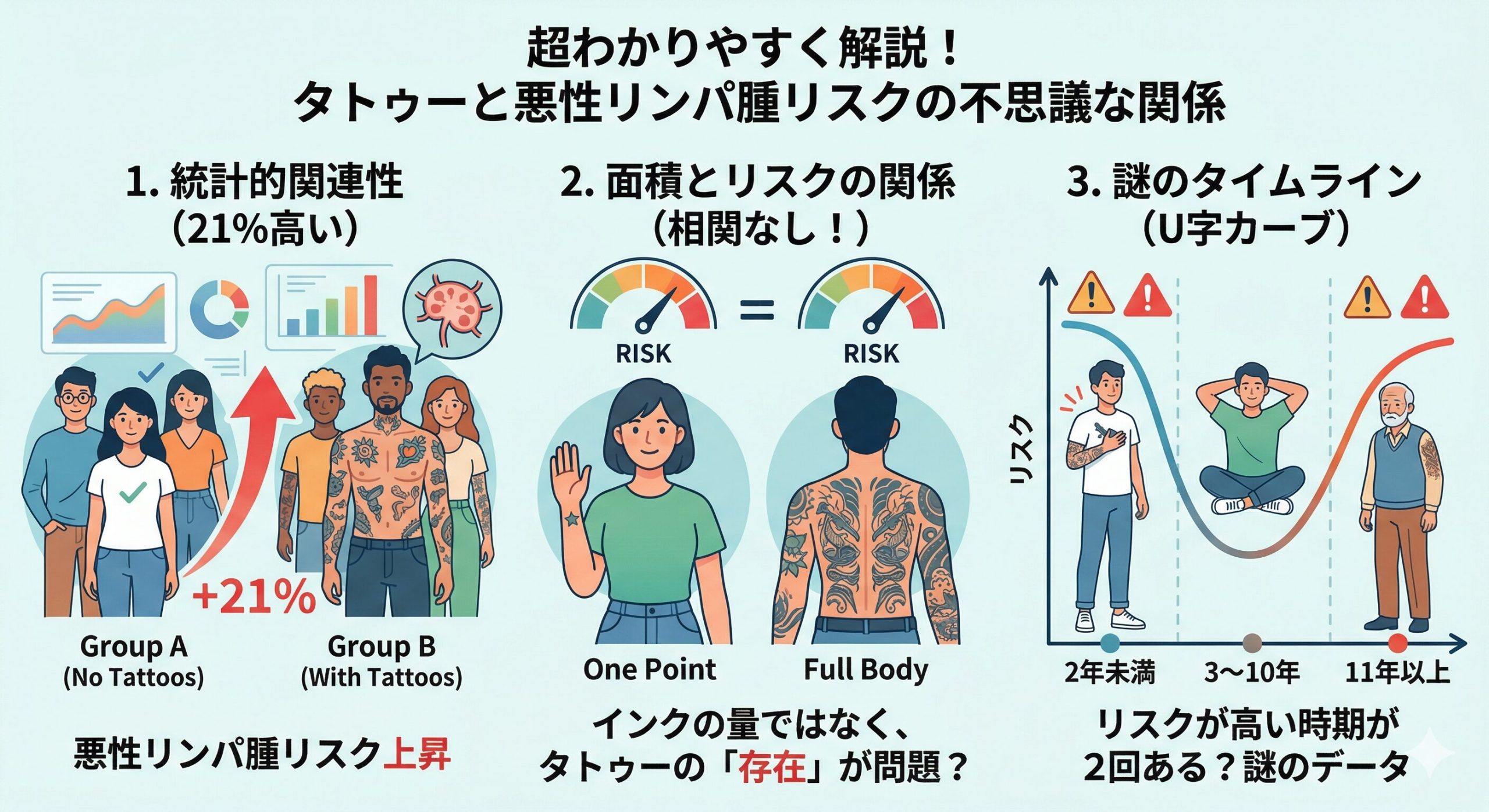 さらに不思議なデータも出ているんだ。タトゥーを入れてからの期間でリスクを見てみると、入れてから「2年未満」の人が一番リスクが高く、その後3〜10年の間はリスクが下がるんだけど、「11年以上」経つとまたリスクがフワッと上がるという、謎のU字カーブを描いていたんだ。ただの化学物質の蓄積なら右肩上がりになるはずなのに、なんでこんな複雑な動きをするのか……。次でそのメカニズムに迫ってみよう!