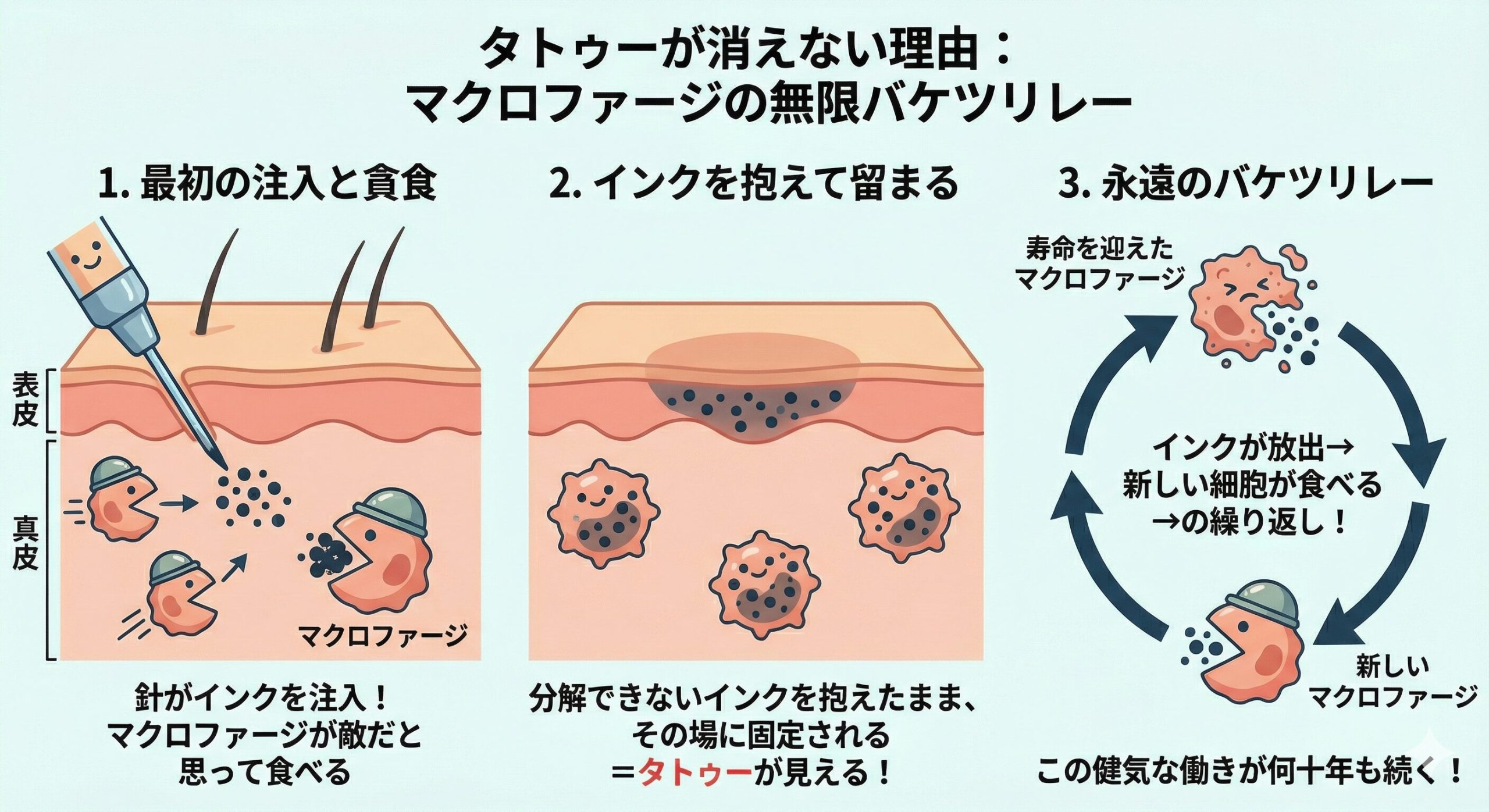 タトゥーの針によって真皮にインクが打ち込まれると、マクロファージが「敵だ!」と思って急行し、インクの粒子をパクパクと飲み込む(貪食する)んだ。でも、インクの粒子は大きくて化学的にも分解できないから、マクロファージはインクをお腹に抱えたまま、皮膚のその場に留まることになる。これがタトゥーが消えずに皮膚に見え続ける理由なんだよ。マクロファージが体を張ってインクを閉じ込めてくれているんだね。