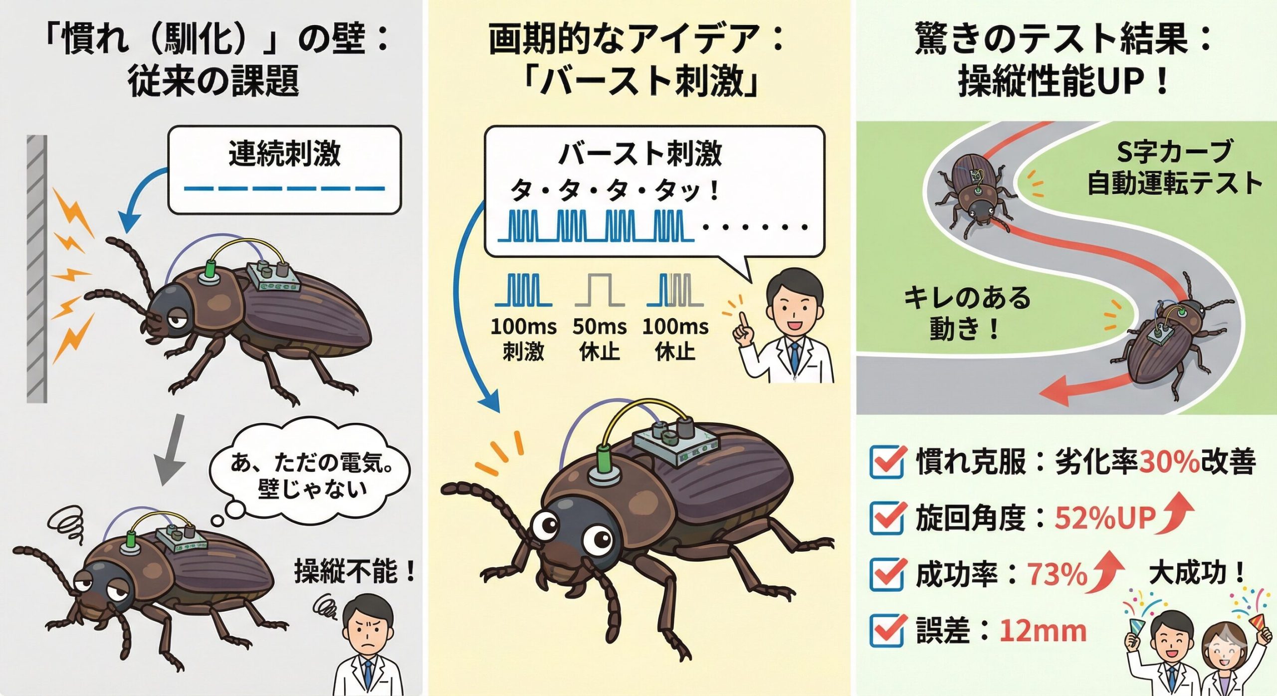 人間の都合で力任せに一定の電気を流して無理やり動かすんじゃなくて、昆虫の神経が普段使っている「タタタタッ」っていう自然なリズム(言葉)で電気を送ってあげる。そうすることで、驚くほどスムーズに指示が通るようになった。
