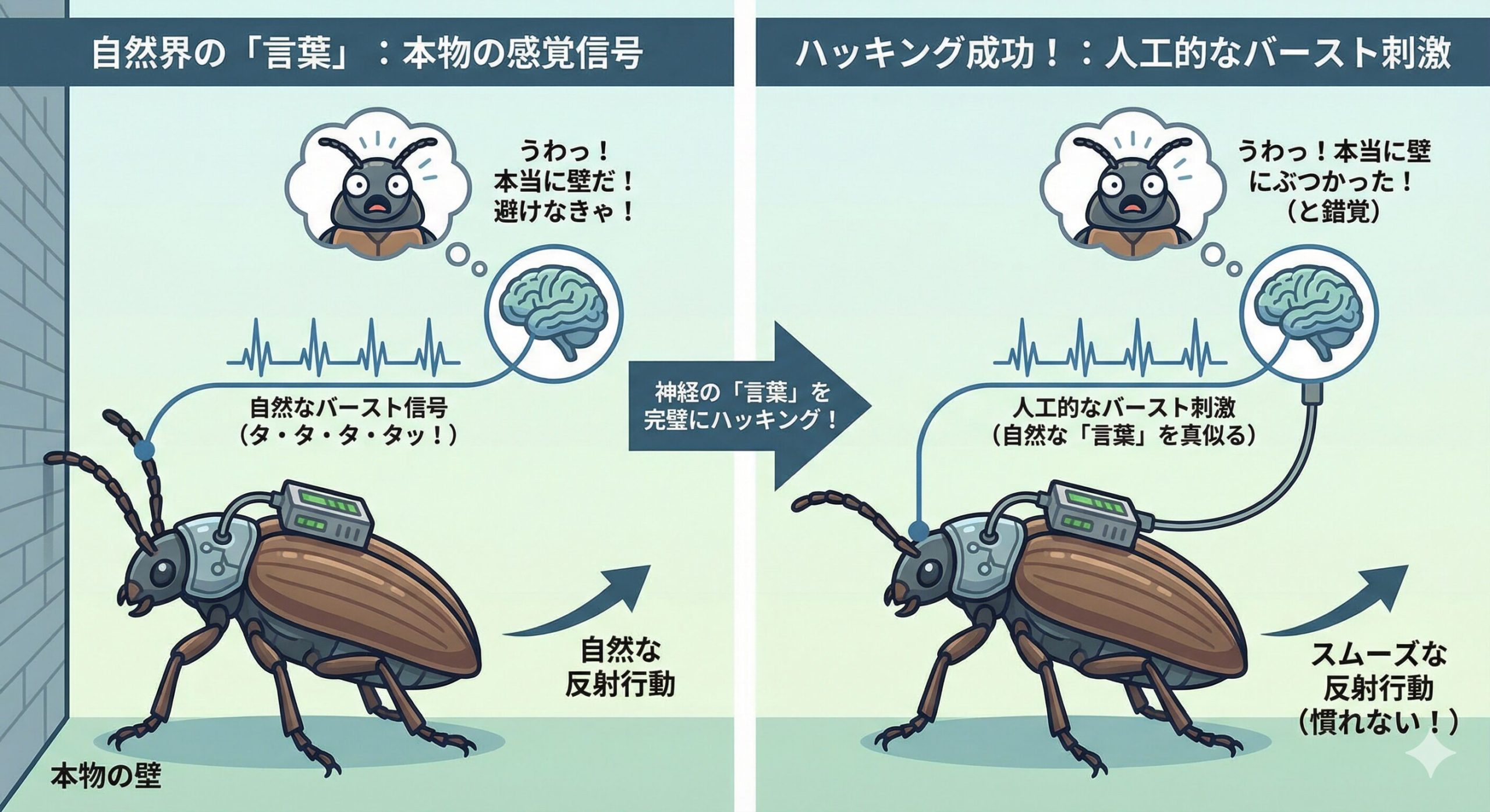 実はこのバースト刺激、昆虫の「本当の感覚信号」を完璧にハッキングしているからなんだ!