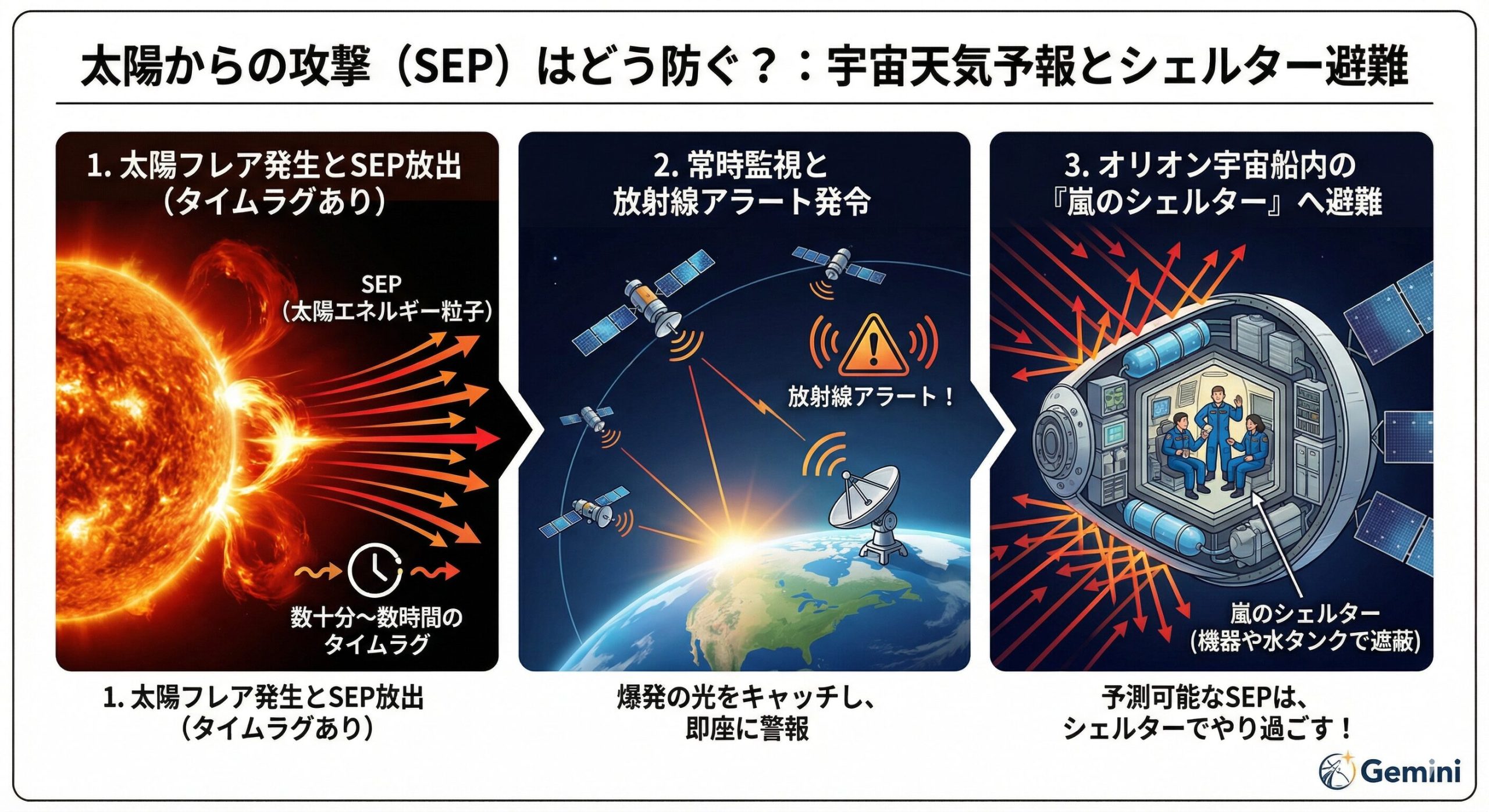 鋭いね!まさにその通り。でも、そこは現代の「宇宙天気予報」の力が発揮される場面なんだ。太陽で巨大なフレアが発生しても、その危険な放射線が地球や月の周辺に到達するまでには、数十分から数時間という「タイムラグ」があるんだよ。
