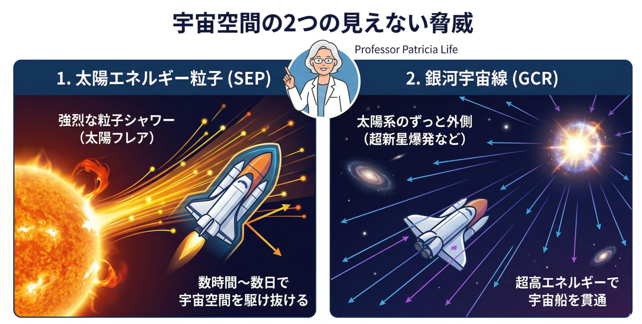 1つ目は、さっきも話した太陽から飛んでくる「太陽エネルギー粒子(SEP)」。太陽フレアなどが原因で突発的に発生して、数時間から数日で宇宙空間を駆け抜ける強烈な放射線のシャワーだよ。