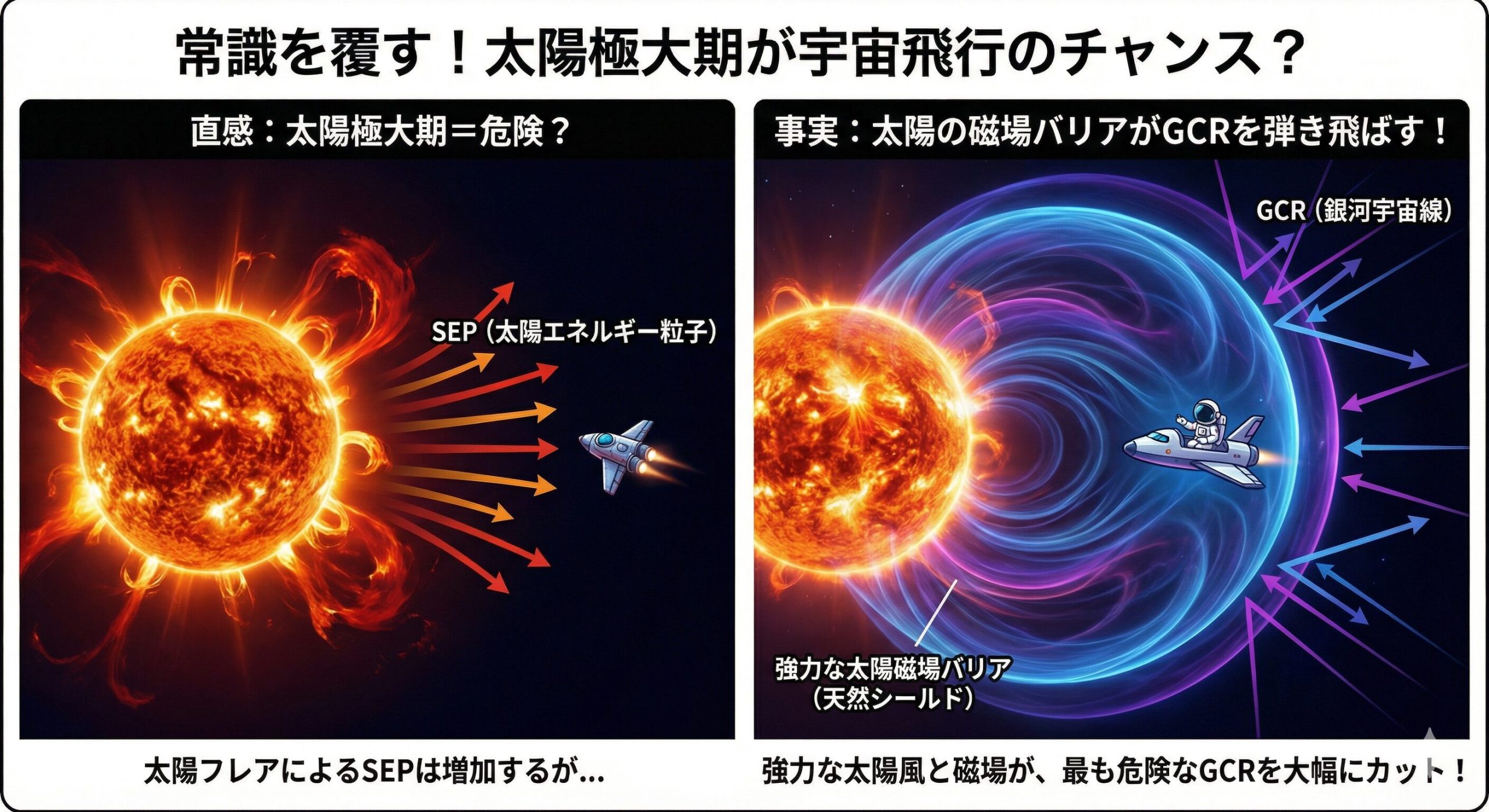 「待って待って!GCRを防げても、太陽自体から飛んでくる太陽エネルギー粒子(SEP)はどうするの!?太陽が活発なら、SEPの直撃リスクは上がるよね?」