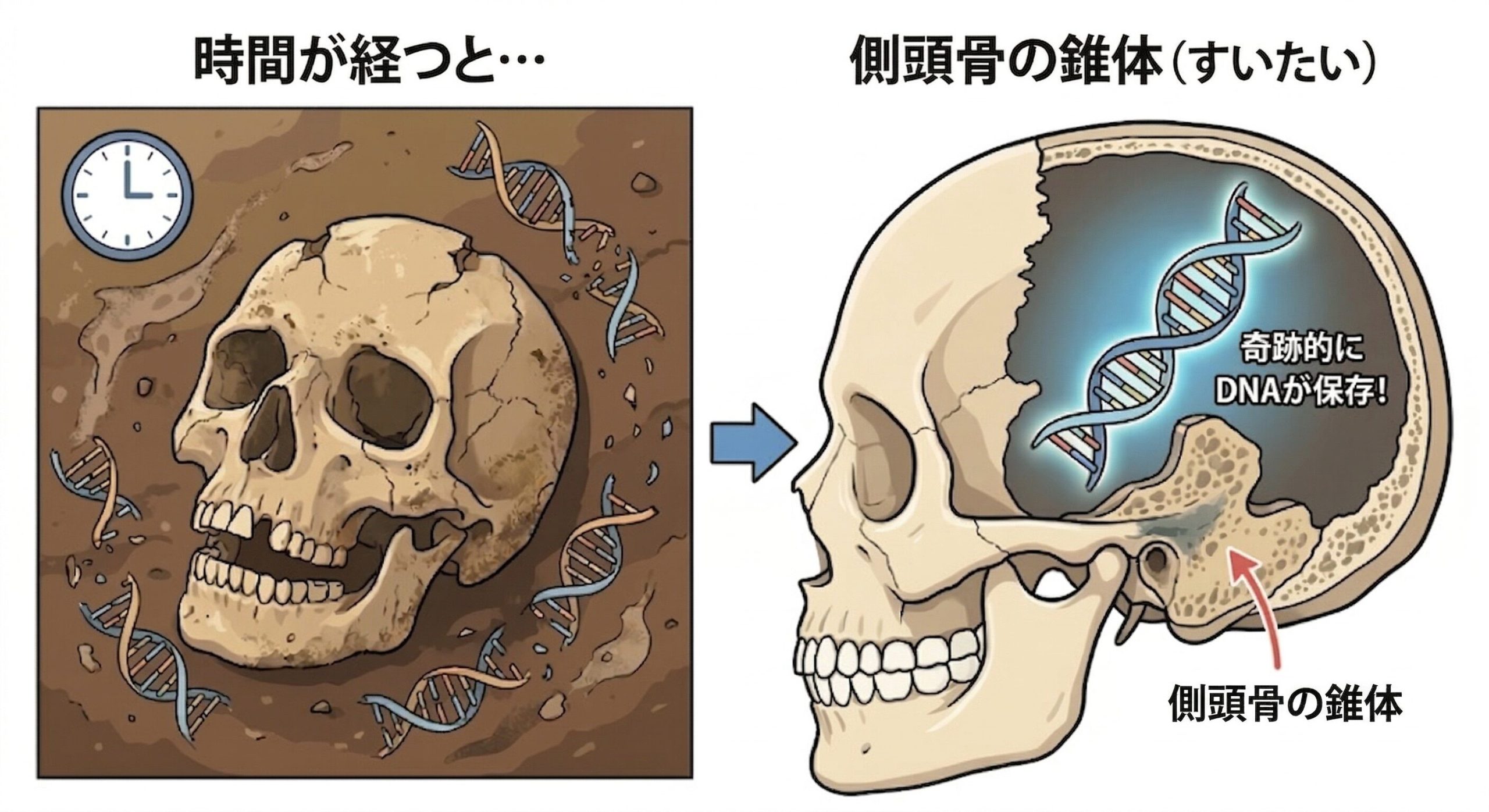 DNAは時間が経つとズタズタに壊れちゃうからね。でも、頭骨の中にある「側頭骨の錐体(すいたい)」という人間の体で一番硬い骨のパーツには、DNAが奇跡的に保存されていることが多いの。
