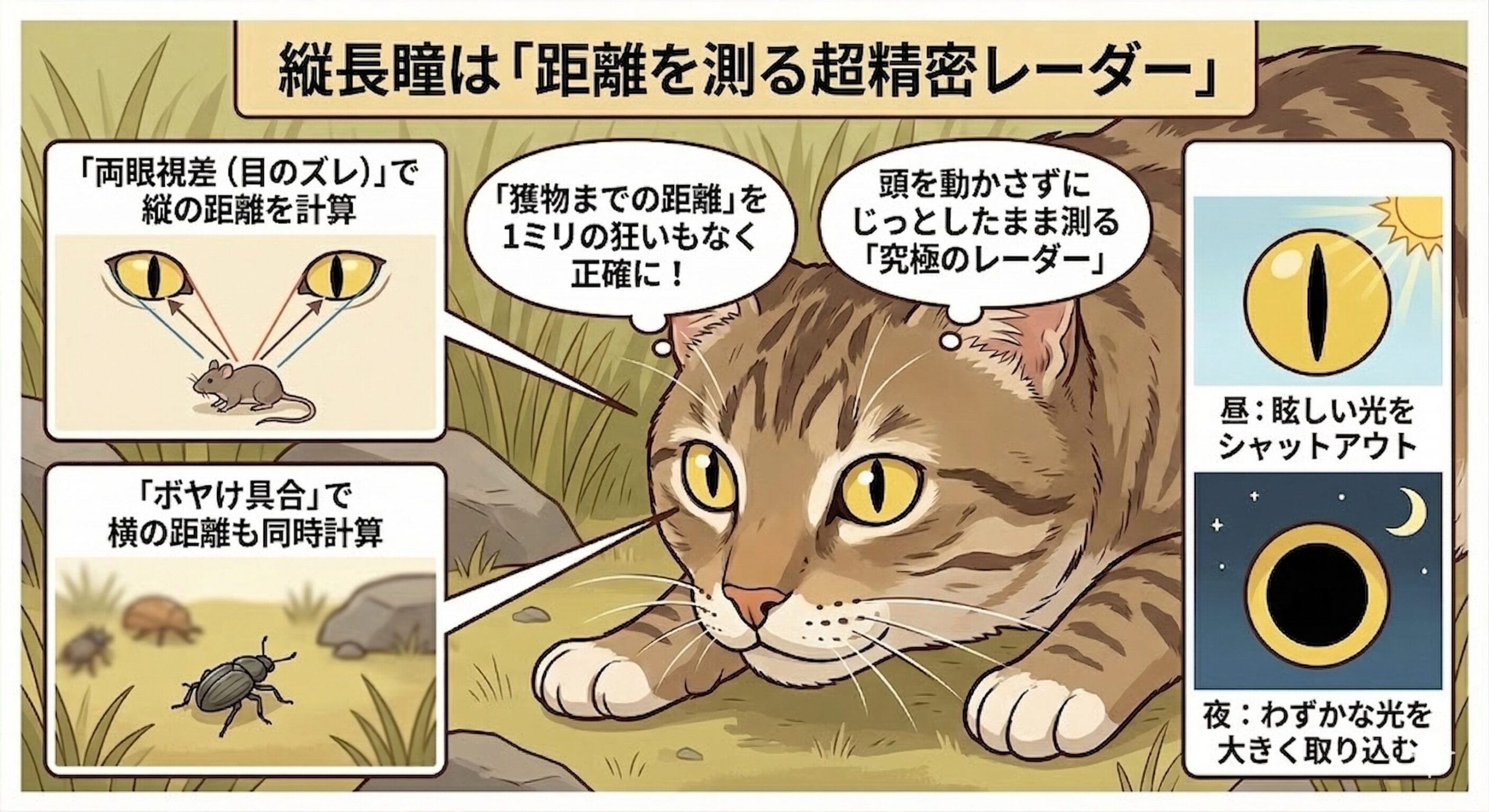縦長の瞳は、左右の目の視界のズレ(両眼視差)を利用して縦方向の距離を測るのにすごく有利なんだ。さらに、ピントが合っていない部分の「ボヤけ具合」を使って、横方向の距離も同時に計算しているんだよ。